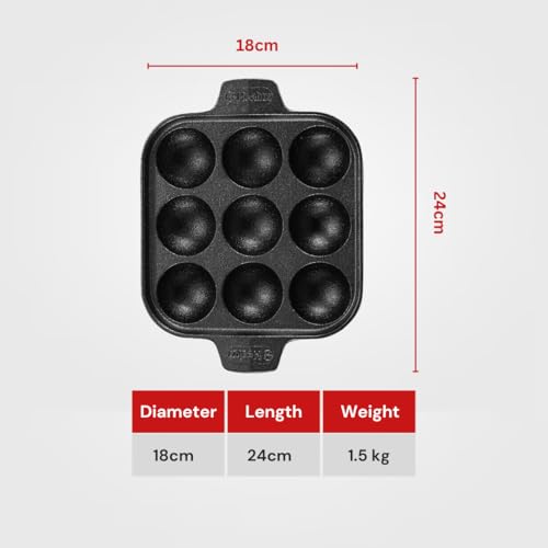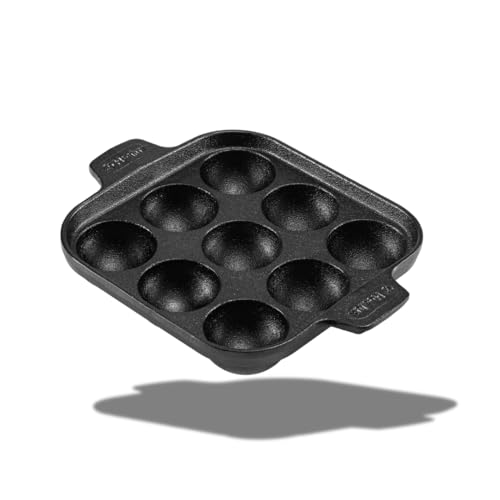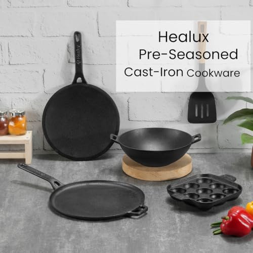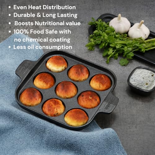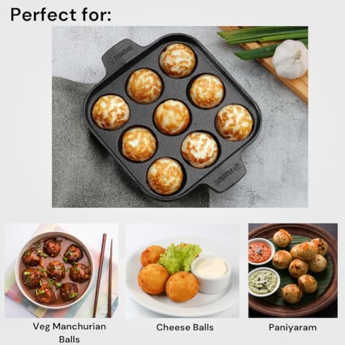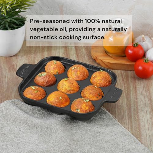 - Healux 18cm Pre-Seasoned Cast Iron Paniyaram Pan/Paddu pan/Appam Maker/Appe pan – 9 Cavity | Toxin Free | Naturally Non Stick | Gas Base