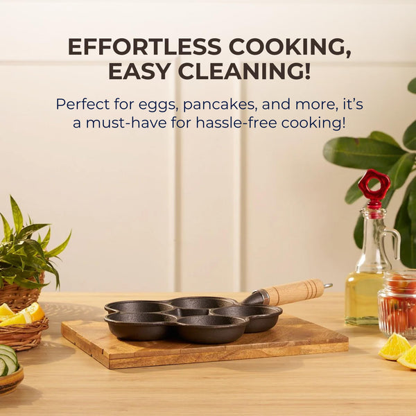 HomeEssentials Cast Iron Egg Pan - 6 Hole Nonstick Skillet with Wood Handle | Omelette Pan | Mini Uttapam Pan | Appam Patra | Litti Maker | Nonstick Pan for Eggs,Dumplings | Egg Frying Pan | 42 cm