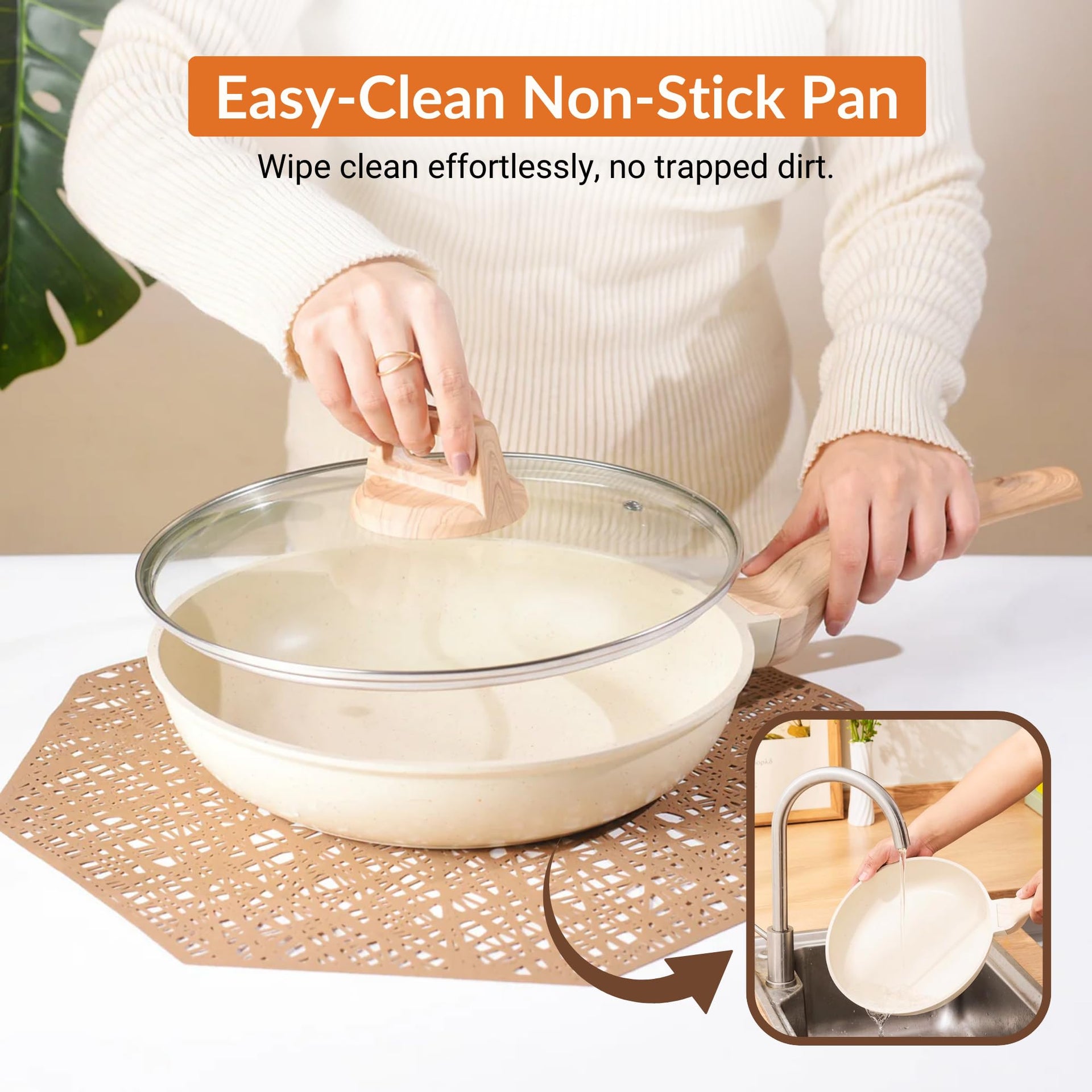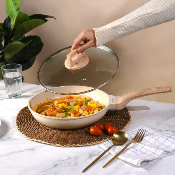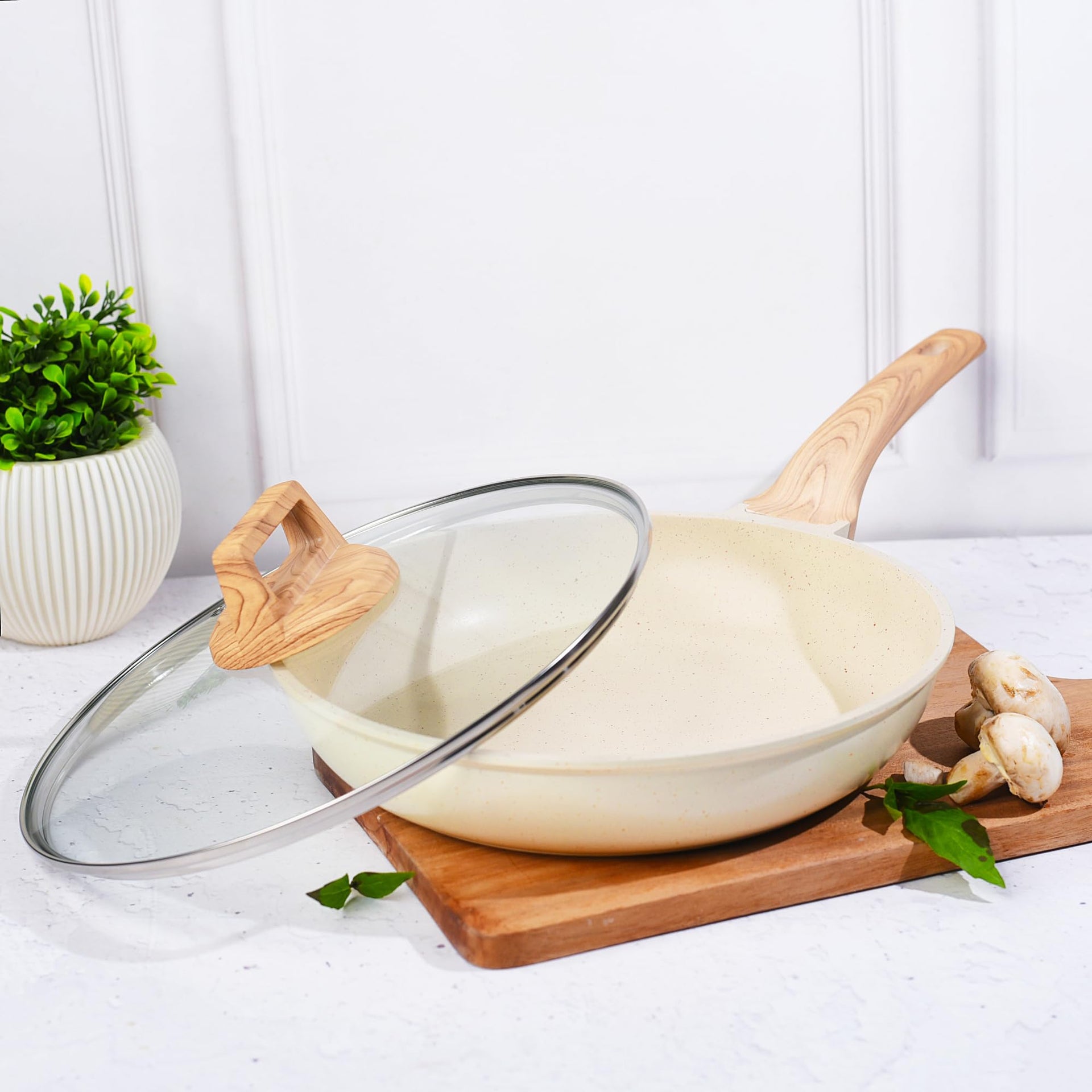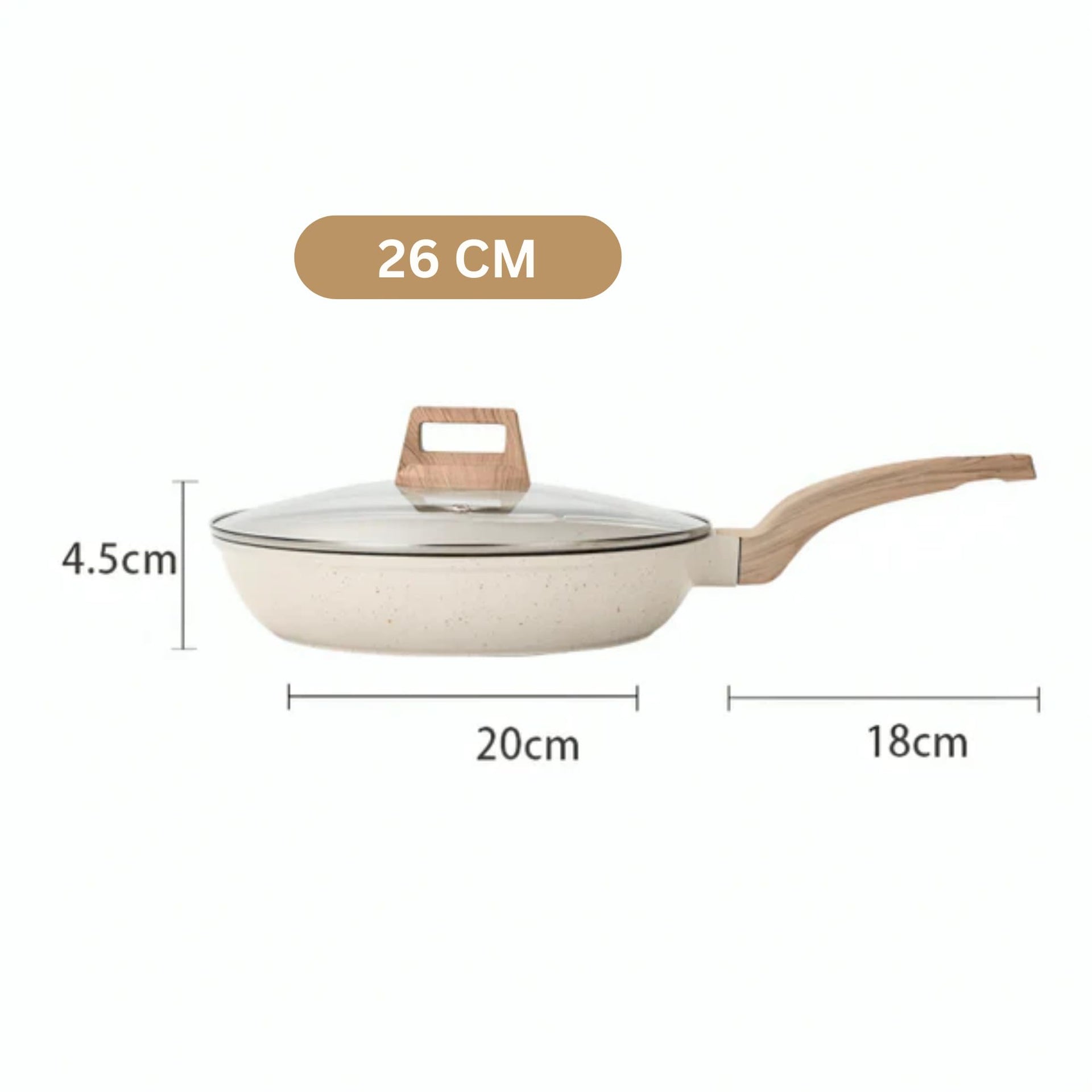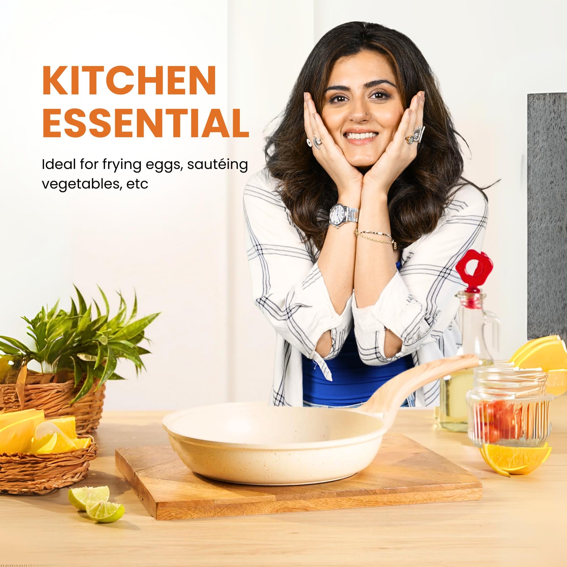 HomeEssentials Non Stick Maifan Stone Frying Pan - Fry Pan with Lid & Wooden Handle/Pre Seasoned 5 Layer Maifan Medical Stone Pan/All Gas & Induction Compatible/Chemical Coating Free,2.2 Litre