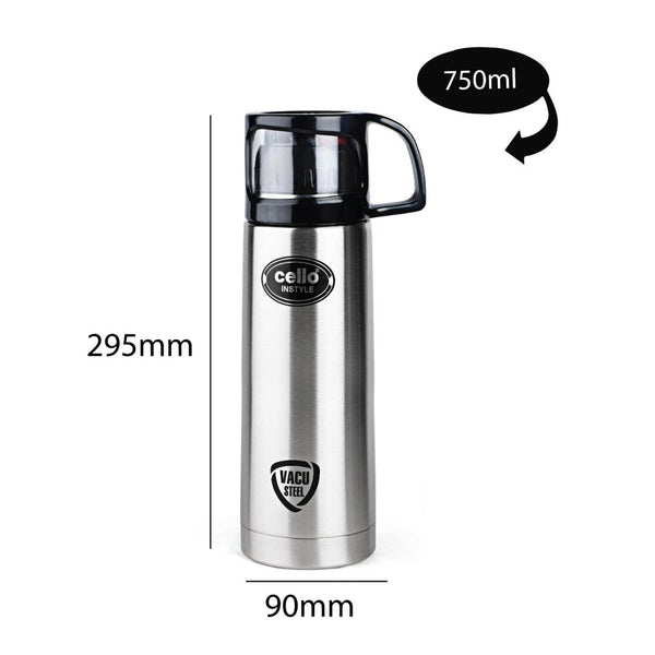 Introducing the Instyle Flask, a 750ml Vacusteel Water Bottle by Cello, designed to cater to your beverage needs all year round. This stainless steel flask is your perfect companion during scorching summers and freezing winters, thanks to its thermo seal technology and vacuum insulation. With this special feature, it retains the temperature of your drink, keeping hot beverages hot and cold ones refreshingly chilly for extended periods. Its wide mouth easily accommodates ice cubes, and the robust cap ensures a tight seal, preventing any leaks and eliminating the need for constant water reheating. This flask also comes with a smart jacket/pouch for extra protection, adding convenience to your hydration routine. Made with high-quality steel and inner copper coating, it excels in heat retention, and its 100% vacuum-insulated stainless steel body maintains beverage temperatures effectively