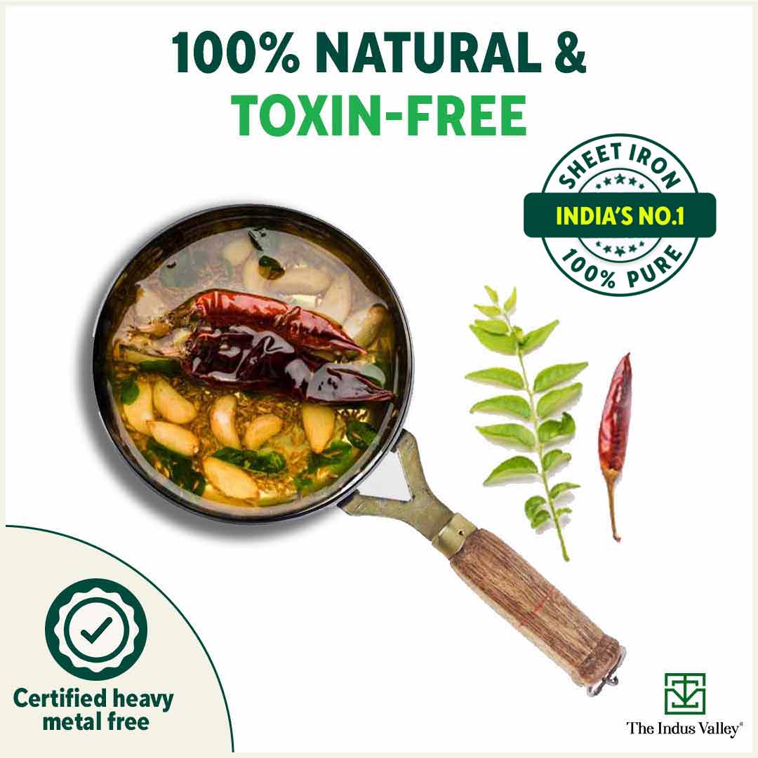 🌿100% NATURAL & TOXIN-FREE: The Indus Valley Pure Sheet Iron Tadka Pan is 100% food-safe and toxin-free. Made from pure iron, without harmful chemical coating.