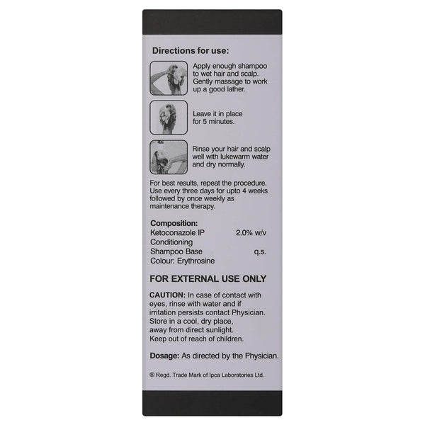 Details: Composition: Ketoconazole IP 2.0% w/v conditioning shampoo base q.s. Dosage: As directed by the Physician. Storage Instruction: Store in a cool dry place, away from direct sunlight.