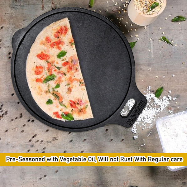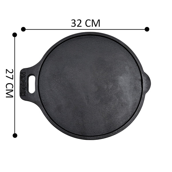 KnobON Pre-Seasoned Cast Iron Flat Dosa/Roti/Paratha/Uttapam Tawa Pan with 2 Side Handle, Dosa Kallu, Iron Tawa Big Size Non-Toxic Cookware Utensi | Gas and Induction Compatible | 27cm, Black