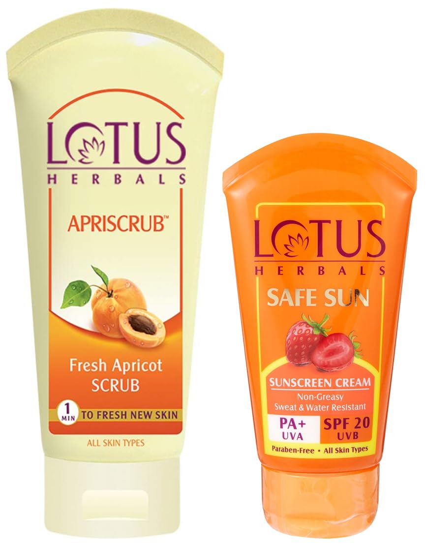Details: Lotus Herbals Apriscrub Fresh Apricot Scrub, 180gTreat Your Skin To The Natural Goodness Of Apricot Apriscrub Fresh Apricot Scrub from Lotus Herbals is loaded with apricot extracts which soften your skin and keep it supple for long hours. This natural scrub gently exfoliates your skin, ridding it off dead cells and reveals fresher, younger looking skin. It boosts skin elasticity to make your skin firmer. Breathe new life into your skin with every wash! Apricot Kernel Apricot is rich in Vitamin C which moisturizes your skin and locks in natural oils. It is also a natural exfoliator which cleanses your skin and helps removal of blackheads. It reduces the appearance of fine lines and wrinkles and boosts skin elasticity to make your skin firmer and younger looking. Walnut Shells Walnut shells are packed with Vitamin D and E which reduce skin stress and delay visible signs of skin ageing. It keeps your skin moisturized and naturally radiant as it is known to lighten skin pigmentation. Walnut Shells add a natural glow to your skin making it look healthy and refreshed.Lotus Herbals Safe Sun Block Cream SPF 20, 50gSun block cream Details Made with extracts of berry and natural sun screen agents, this cream effectively blocks the UVA and UVB rays of the sun and helps preserve the youthfulness of your skin. Good for protection from direct exposure to sun for shorter period. Good for all parts of the body, reapply frequently. How to Use Apply cream liberally and evenly on face and exposed parts of body before exposure to sun. Cream will not get washed/wiped with water/sweat.Qty 100gm