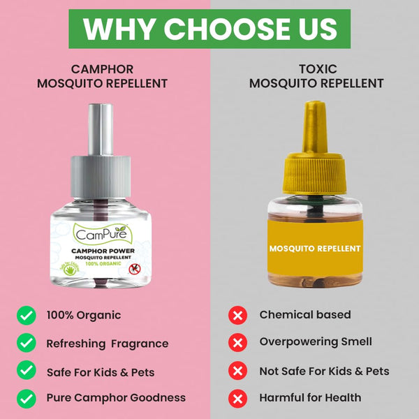 - HEALTHY REPELLENT WITH CAMPHOR: CamPure Power does not have any harmful/cancer causing chemicals such as TFT, DEET, Kerosene and is therefore non toxic with no side effects. The fragrance of camphor has a calming effect on the mind and brings a good night's sleep