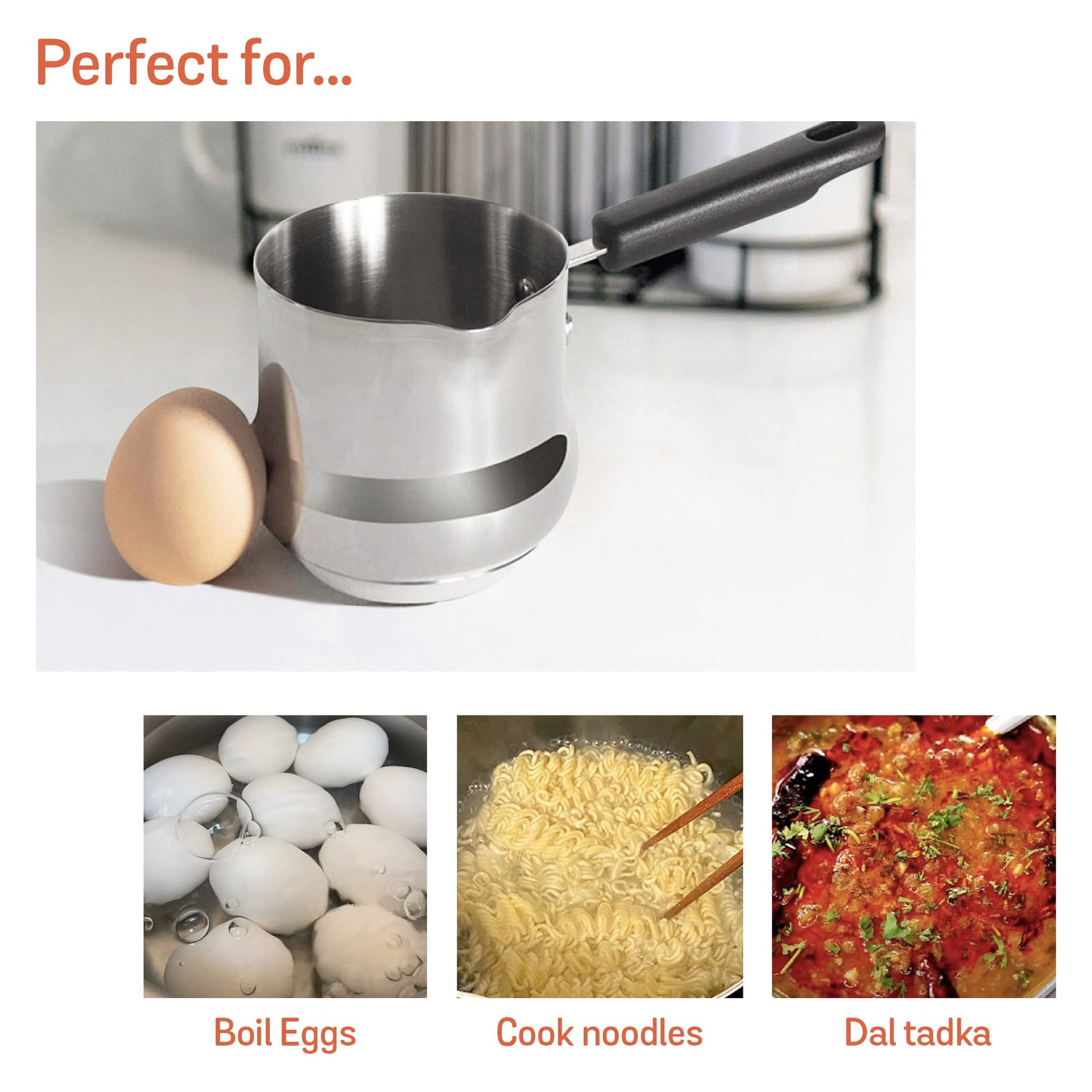 - π₯ Kitchen Workhorse: This mini pot is truly multipurpose. Perfect to warm milk, prepare soup, boil eggs, cook noodles, melt butter, rustle up tadka for daal, and much more. Its compact size makes it ideal to prepare baby food, reheat leftovers, or prepare food for a single serving