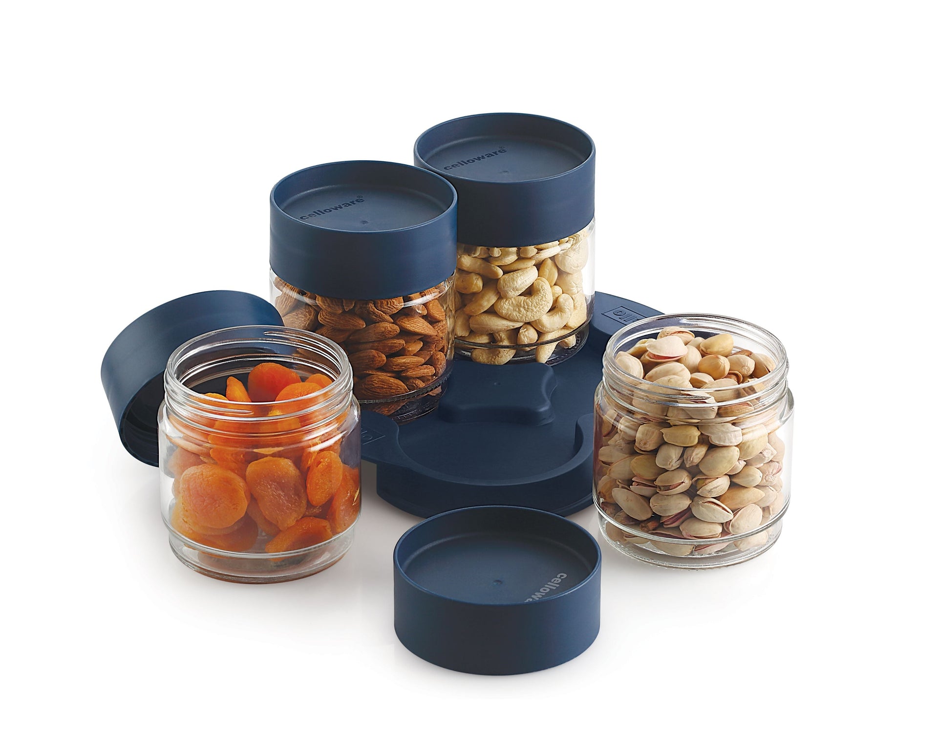 The Cello Modustack Glassy Tray Gift Set, featuring five pieces in blue and maroon, consists of four airtight glass jars with a coordinating tray. These wide-mouth jars are effortless to clean and use, designed for stacking convenience with non-slip rims on the unbreakable plastic lids. Ideal for storing an array of snacks like candy, cookies, and nuts, this set is also a perfect choice for gifting.