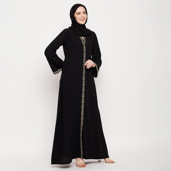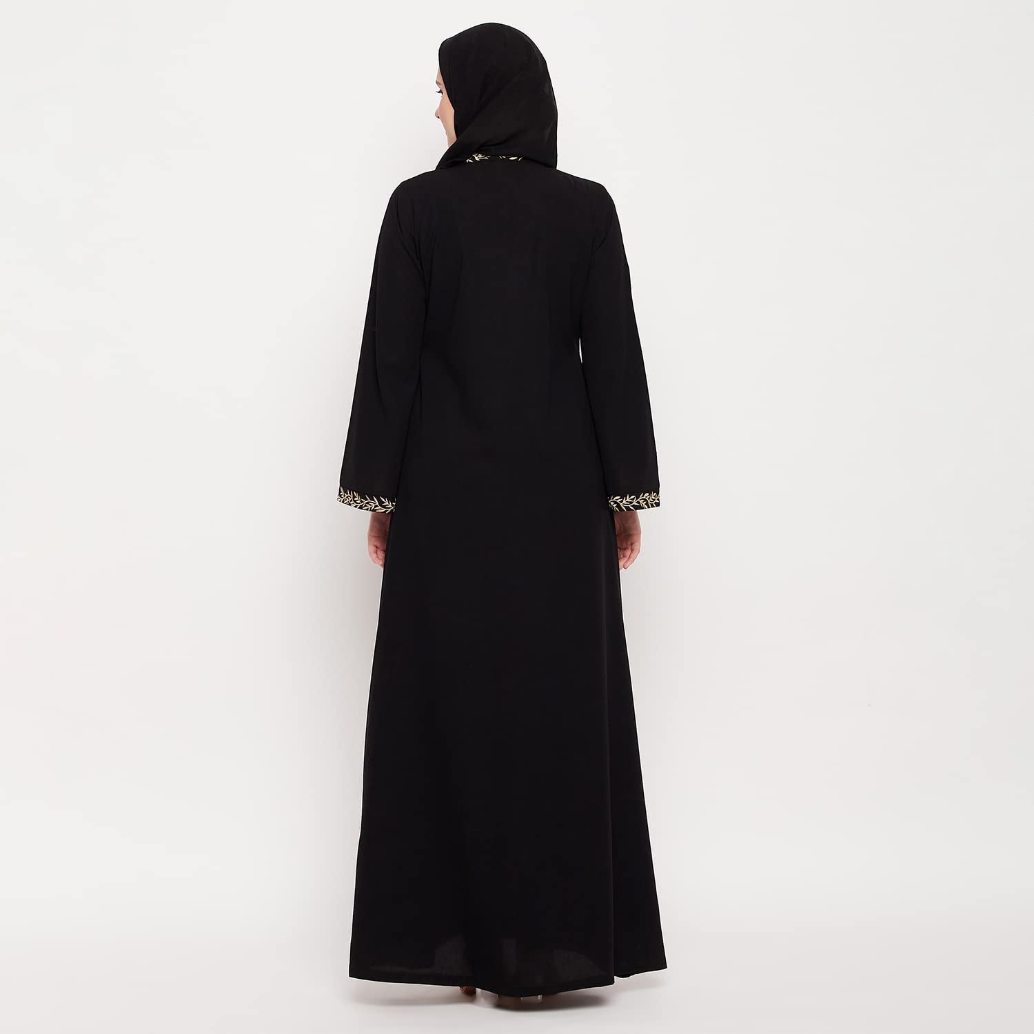 Nabia Black Solid Abaya Burqa, has V- neck, full sleeves, slip-on closure and flared hem