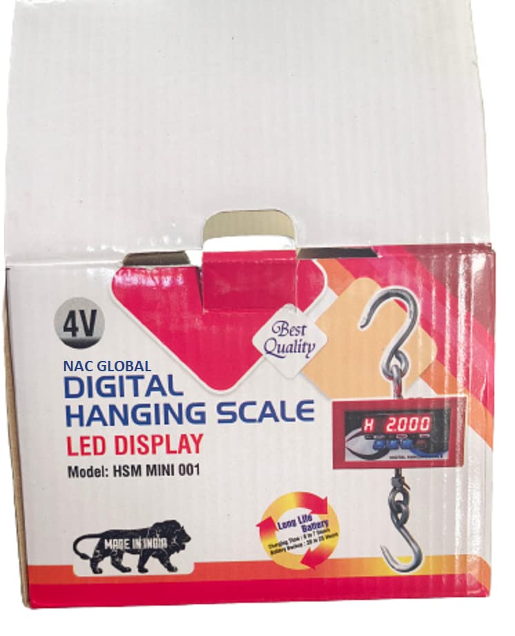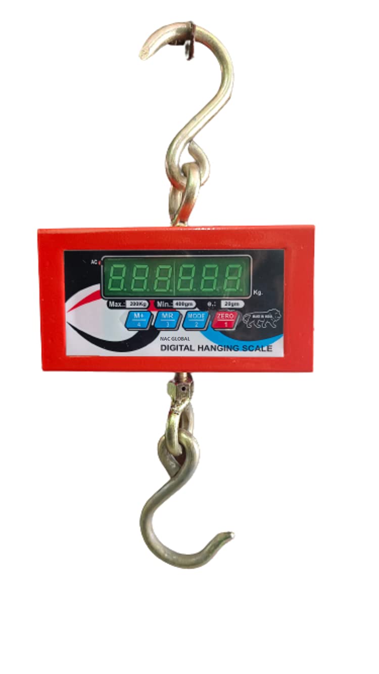 Details: Nac Global Hanging Weighing Scale 200kg Mini Crane scale Electronic Portable Weight Machine for Luggage Agriculture Fishing Scrap Digital Multipurpose Weighing Scale crane scale 200kg weight machine for cyliners farm hook weight machine Portable and Safe: Directly Plug-in 220V Power adapter or use battery to operate the machine which provides power backup of upto 8 hours. The scale will also automatically switch off when it is in non-use condition, to save power for General Grocery stores, Kitchens, Parcel weighing, Warehouses, Retail weighing and all kinds of Industries. Can be used anywhere for high accuracy weighing of 2gr Package:Weighing Scale ,Power Adapter
