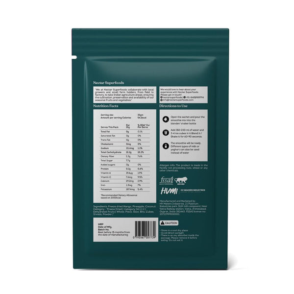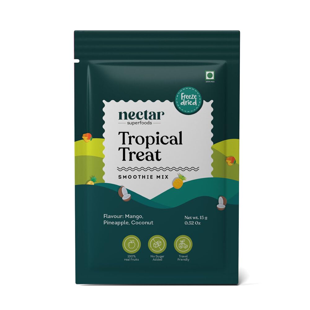 Nectar Superfoods Freeze Dried Tropical Treat Smoothie Powder - Added 100% Natural Fruits , Mango, Pineapple & Coconut, Healthy Ingredients for Nutritious Smoothies, Vegan & Convenient - 15g Sachet Pack