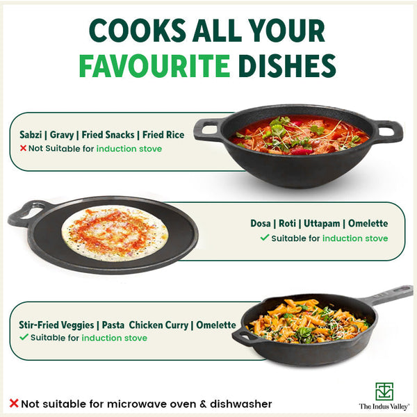 Super Smooth Cast Iron Set: Frypan+ Kadai+ Tawa, Kitchen set for Home, Nonstick, 100% Pure,Toxin-free, Free ₹400 Tadka Pan