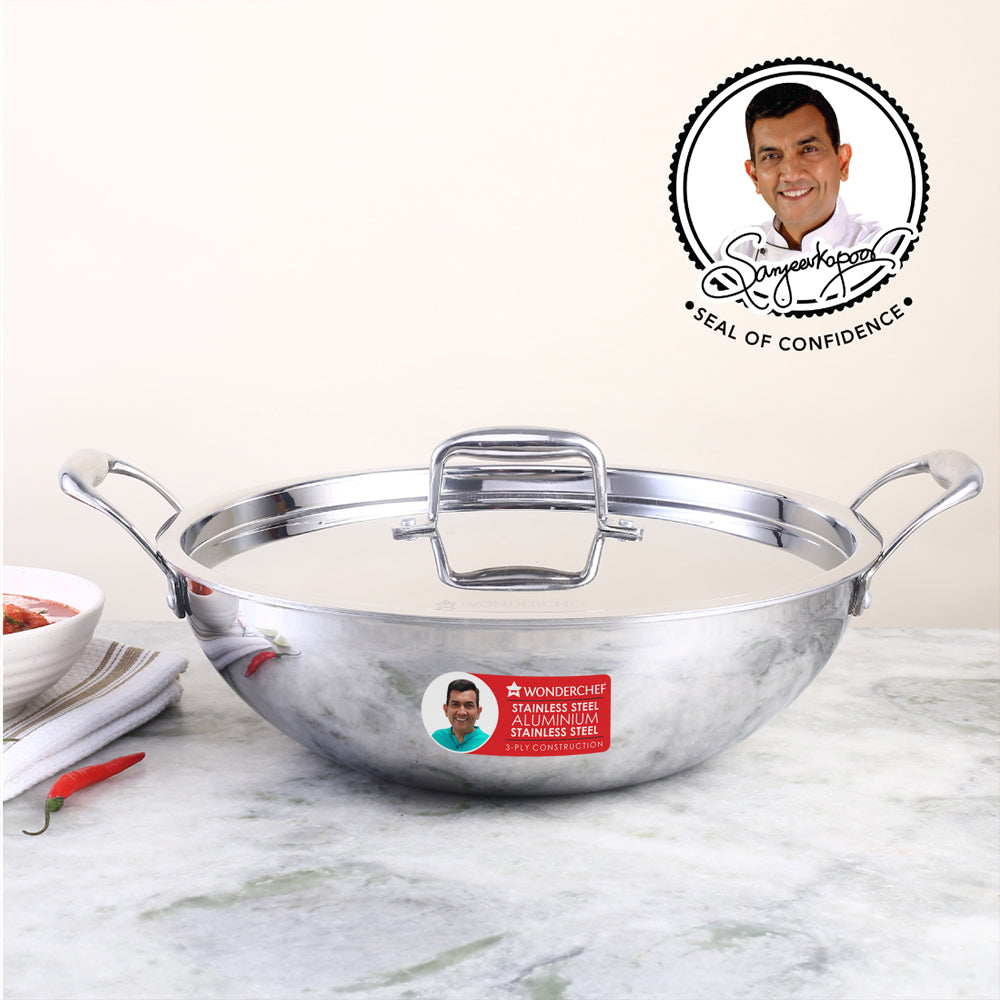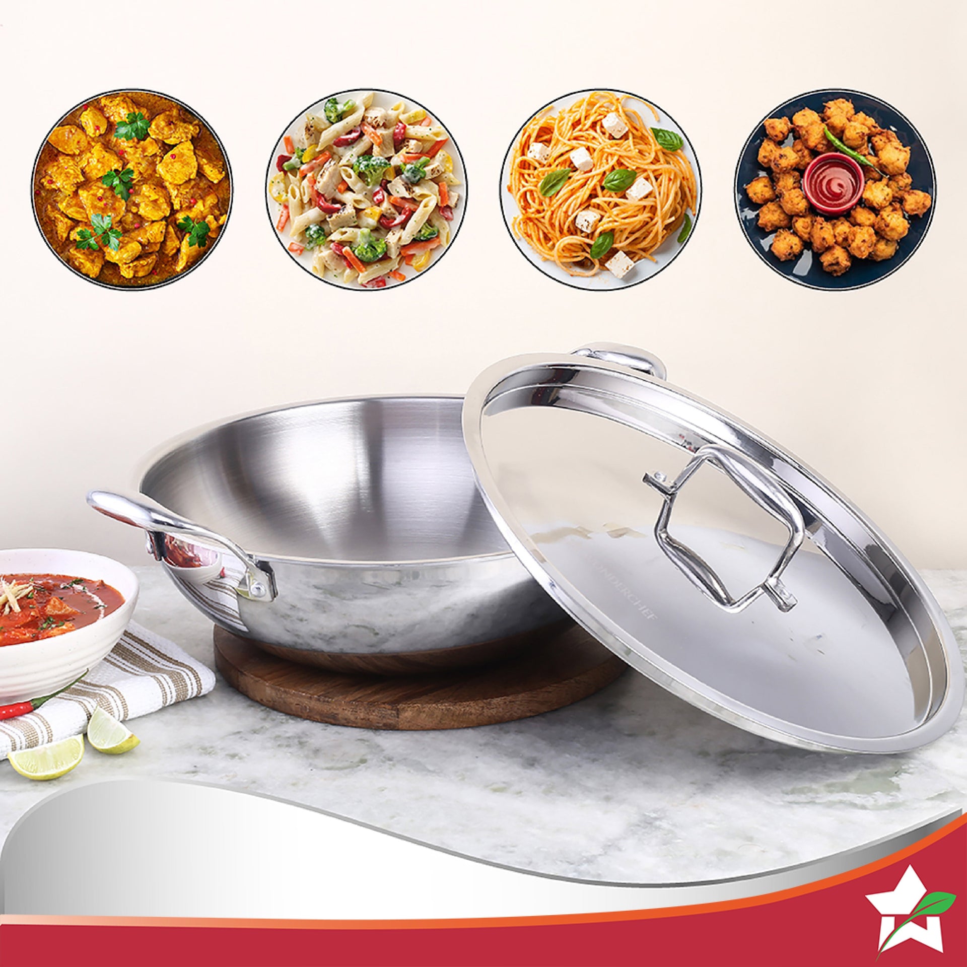 Nigella Tri-ply Stainless Steel 24 cm Kadhai with Lid | 2.2 Litres | 2.6mm Thickness | Kadhai with Induction base | Compatible with all cooktops | Riveted Cool-Touch Handle | 10 Year Warranty