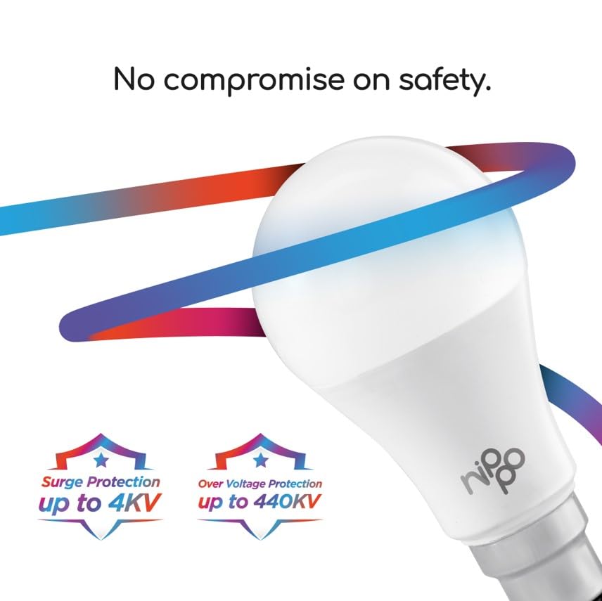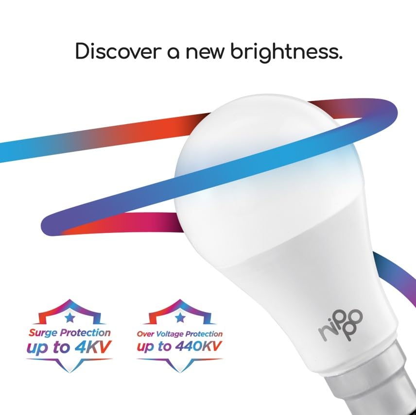 Details: NIPPO 9W LED Bulb (2 Pack) Base 22, Cool Day Light, 1 Year Warranty, Voltage Surge Protection, High Energy Savings