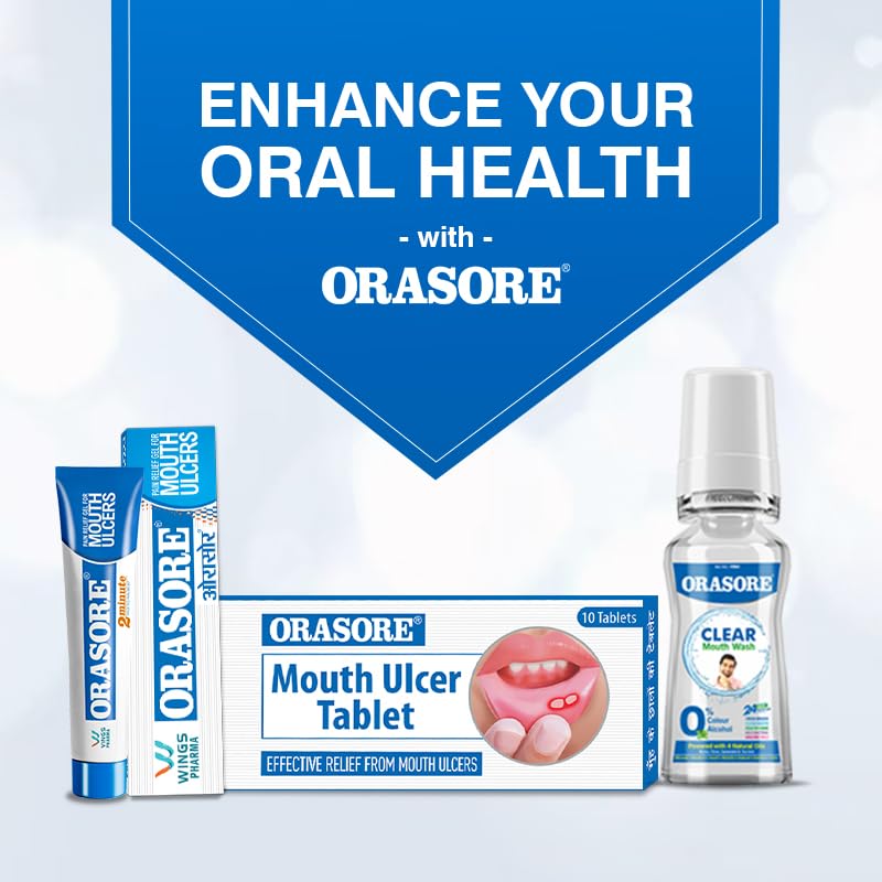 Details: Orasore Ultimate Oral Care Combo Pack with: ✅ Orasore Mouth Ulcer Gel 12gm ✅ Orasore Mouth Ulcer Tablets (1x10) with Free Pen ✅ Orasore Clear Mouth Wash (100ml) Small things in life can bring joy, they can also spoil the fun. Like mouth-ulcers. Imagine a table with freshly-fried samosas, Inviting you to dig your teeth into it.. But you can't because you have a mouth-ulcer. Don't worry, help is at hand - Just a dab of Orasore Gel would do! :) How Orasore Mouth Ulcer Relief Gel helps you? Its triple action formula diminishes the pain, prevents inflammation in the mouth and kills the bacteria and fungi that infect the mouth. How Orasore Mouth ulcer tablet gives complete treatment from mouth ulcers? Orasore mouth ulcer tablet have a unique composition of B-Complex Vitamins such as B2, B3, B9 & Probiotics (Lactic Acid Baccilus) that improve the digestion system of body and give complete treatment from mouth ulcers. Directions For Use Orasore Mouth Ulcer Gel: 1. Wash your hands properly. 2. Apply sufficient quantity of Orasore Gel to cover the affected area. 3. Rub Orasore Gel gently on the affected area. 4. Procedure may be repeated after every 3 to 4 hours or as directed. Dosage & Administration for Orasore Tablet: Adult – 1 tablet in Morning and Evening for 3 to 5 days. Children ( 6–12 Yrs ) – 1 tablet in a day for 3 to 5 days. ✅Orasore Clear Mouthwash 💯No Colour & No Alcohol - Alcohol-free formula hydrates, soothes, and relieves mouth without burning or irritating. Gentle enough for the most sensitive mouths. 💯100% Ayurvedic that Cleans & Soothes - Orasore Clear Mouthwash improves Oral Health without irritation or burning. 💯Antibacterial & Antiseptic - 12 Powerful Natural Ingredients that Makes Teeth Strong, Prevents Gum Infection, and Stops Tooth Decay & Cavities 💯Kills Bad Breath - Orasore Clear Mouthwash is indicated for dental freshening, pyorrhea, dental carries and dantshool.