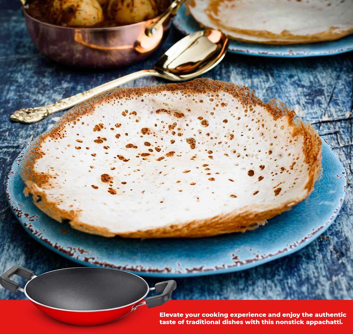 Details: Enjoy appams, pancakes, malpua, palada at home.| Scratch and abrasion resistant technology Gas Stovetop Compatible | Change the way you cook Our advanced PANCA non-stick utensils heat evenly and save cooking time | Strong and sturdy cool-touch handle | Metal spoon friendly | They take up little space and help keep your kitchen super neat | Color: Red, Material: Aluminum Package Contents: 1-Piece Appachatti with Lid (23 cm)