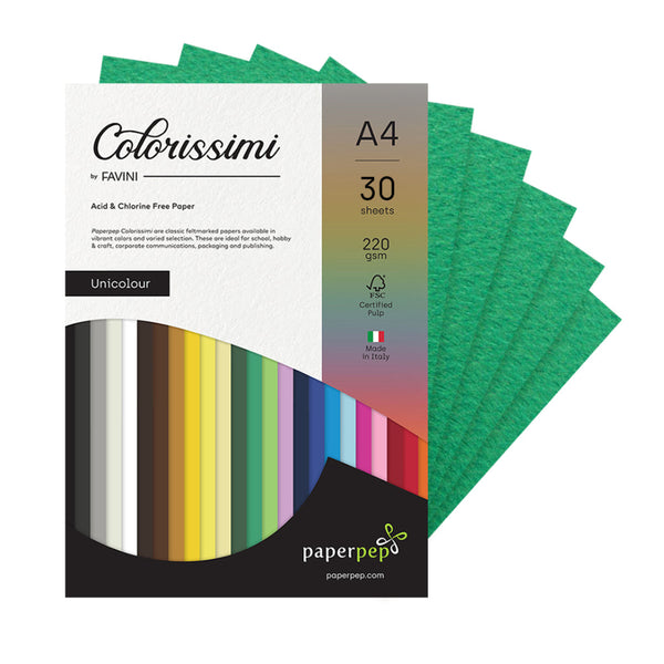 Paper Pep Colorissimi is a high quality coloured in the pulp, 220 gsm paper. It is acid free and therefore very long lasting. There is a marked difference in the surface finish between the two sides. One side is a delicate felt-marked surface, which provides excellent grip for pastels, charcoal etc, the other side is smooth. Produced with FSC certified pulps from responsibly managed forests that are respectful of environmental, social and economic standards. The broad range of 27 colours, from delicate pastel shades to strong, bright colours makes Paper Pep Colorissimi ideal for various applications such as display and presentation, paper construction, collage, pastel and charcoal paintings, coloured pencils, pen and ink, origami, report covers etc. Ideal for different techniques, from scrapbooking, cardmaking, or running through your die cutting and embossing machine to create embellishments for scrapbook layouts, tags, gift bags, and a whole lot more, make them the perfect and complete range for both students and artists. Create something amazing, cut out wonderful shapes and just let your imagination go bonkers! Due to its thickness and texture, it should be tested on one sheet before printing, but nevertheless it is suitable for both inkjet and laser printing. Paper Pep Colorissimi is available in four sizes: A5, A4, 4 x 6 Inch . Made in Italy.