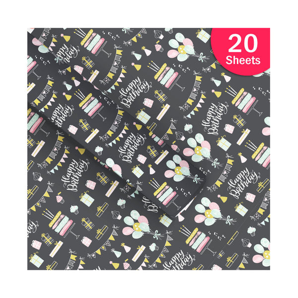 Paperpep Black Birthday Print Gift Wrapping Paper 19"X29" Pack Of 20 Sheets For Gift Packing Birthday, Anniversary, Diwali, Christmas, All Occasions & Events, Crafts, Return Gifts