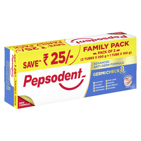 Details: Pepsodent Germicheck 8 Actions Toothpaste Choose New Pepsodent Germicheck 8 Actions Toothpaste For Your Family’S Whole Mouth Protection. It Contains An Advanced Anti-Germ Formula With Cpc Technology, Clove And Neem Oil That Fights Germs Not Only On Your Teeth But On Other Different Parts Of The Mouth As Well - Cheeks, Gums And Tongue To Give You 8 Scientifically Proven Whole Mouth Benefits. Step Up Your Family’S Dental Hygiene Protection By Brushing With The New Pepsodent Germicheck 8 Actions Toothpaste. It Gives You 8 Scientifically Proven Whole Mouth Benefits, Which Are (1)Cavity Protection, (2)Removal Of Plaque, (3)Fights Bad Breath, (4)Healthy Gums, (5)White Teeth, (6)Gives Fresh Breath, (7) Protects The Enamel, (8) Protects Teeth From Staining For A Good Oral Health And Protection For Your Entire Family – Follow A Good Dental Care Routine For Best Results: Brush Day And Night Or Twice A Day With Pepsodent Toothpaste And Toothbrush For Children Under The Age Of Six – Use A Pea Sized Amount Of Toothpaste And Brush Under Adult Supervision. Do Not Swallow. Remember To Change Your Toothbrush Every 3 Months And Visit Your Dentist Regularly. A Quality Product Of Unilever Dental Research'S Regd. Made In India. Recognised By Fdi World Dental Federation