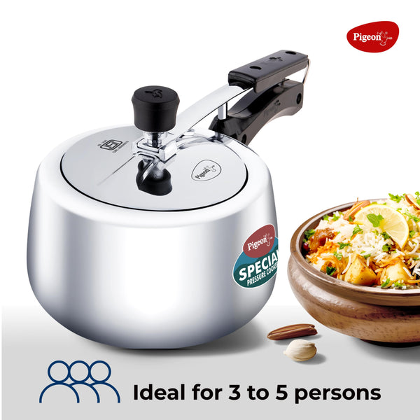 - Base: Pigeon Pressure Cooker comes with an Aluminium Induction base which is thick and machine pressed. The slight concave bottom ensures shape is retained for longer.
