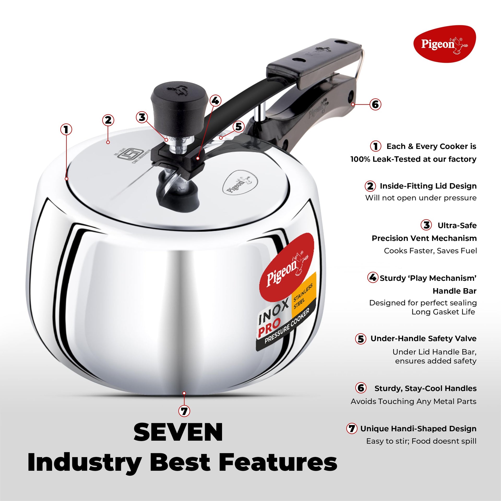 Details: This Inox pro pressure cooker is made from high quality food grade stainless steel and has sandwich bottom making it compatible for induction , ceramic , halogen and gas stove cooking.