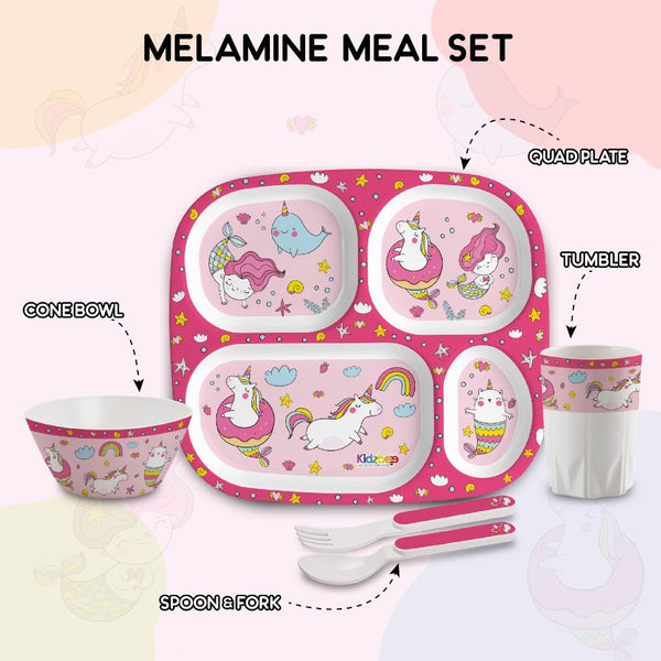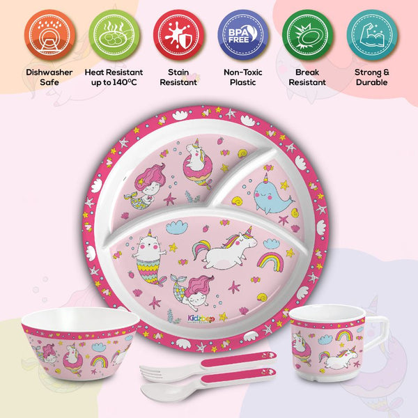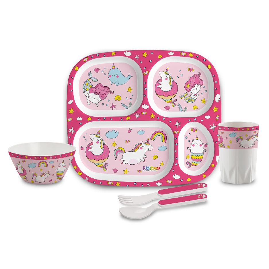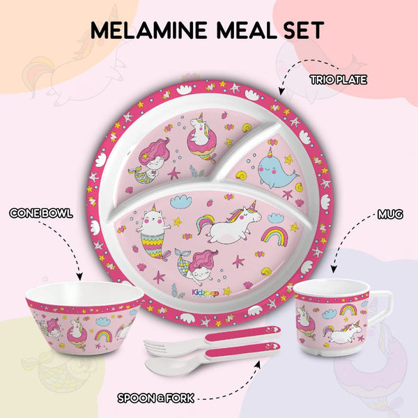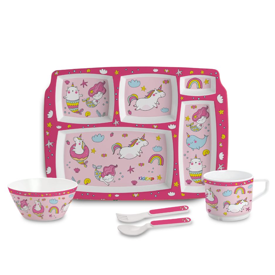 Product Description Introducing the Kidzbee's Melamine collection Set of 5 seamlessly blends safety and style for your little ones. Not only visually appealing, but they also ensure shatterproof reliability and dishwasher safety. The designs are printed with food-grade ink, prioritizing your child's safety during mealtime. Kidzbee's Melaware is not just a delightful addition to your table. It's a promise of trust and a happy, healthy dining experience for your kids! Kidzbee Trioplate comes with a Plate, Bowl, Mug, Fork, and Spoon.