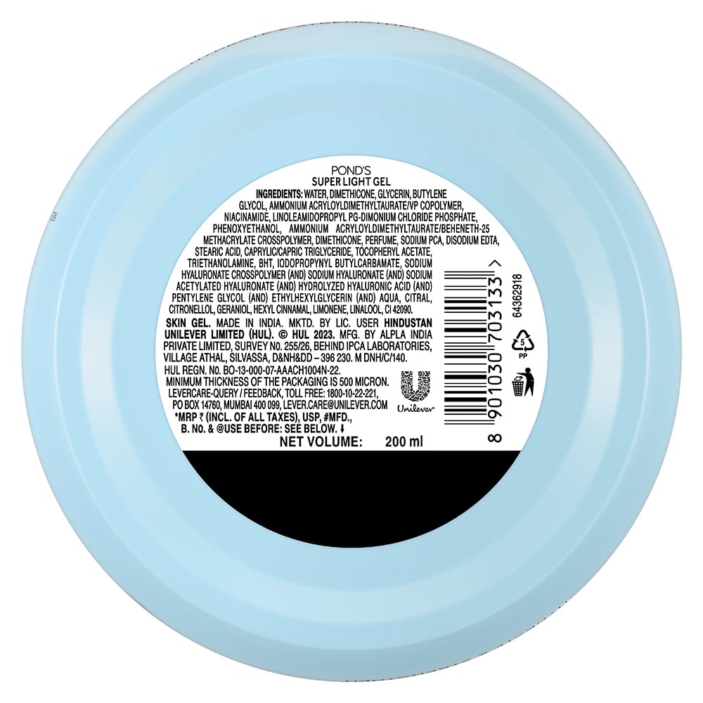 Details: Looking for a gel moisturizer that can keep your skin hydrated for 24 hours? Look no further than the Ponds Super Light Gel 247gm! This gel based moisturizer for oily skin is perfect for all seasons and is enriched with Hyaluronic Acid, Vitamin E, and Glycerine to provide deep nourishing care for your skin. Unlike regular creams, the super light formula of Ponds light gel absorbs quickly into the skin, leaving no sticky feeling behind. The gel moisturizer helps restore your skin's moisture balance, making it soft, smooth, and moisturized. The Hyaluronic Acid in the Ponds gel formula improves your skin's natural moisture-holding capacity, while the non-oily texture keeps oiliness and stickiness at bay. The 24-hour moisture lock technology in the Ponds gel moisturizer ensures that your skin stays hydrated all day long, while its lightweight formula spreads quickly on the skin, making it easy to apply. This gel based moisturizer is perfect for all skin types and can be used throughout the year, even in the scorching summers. So say goodbye to your moisturizing woes with Pond's Institute's lightest gel formula - the all-new Ponds Super Light Gel. Get ready to enjoy soft, smooth, and glowing skin all day long!