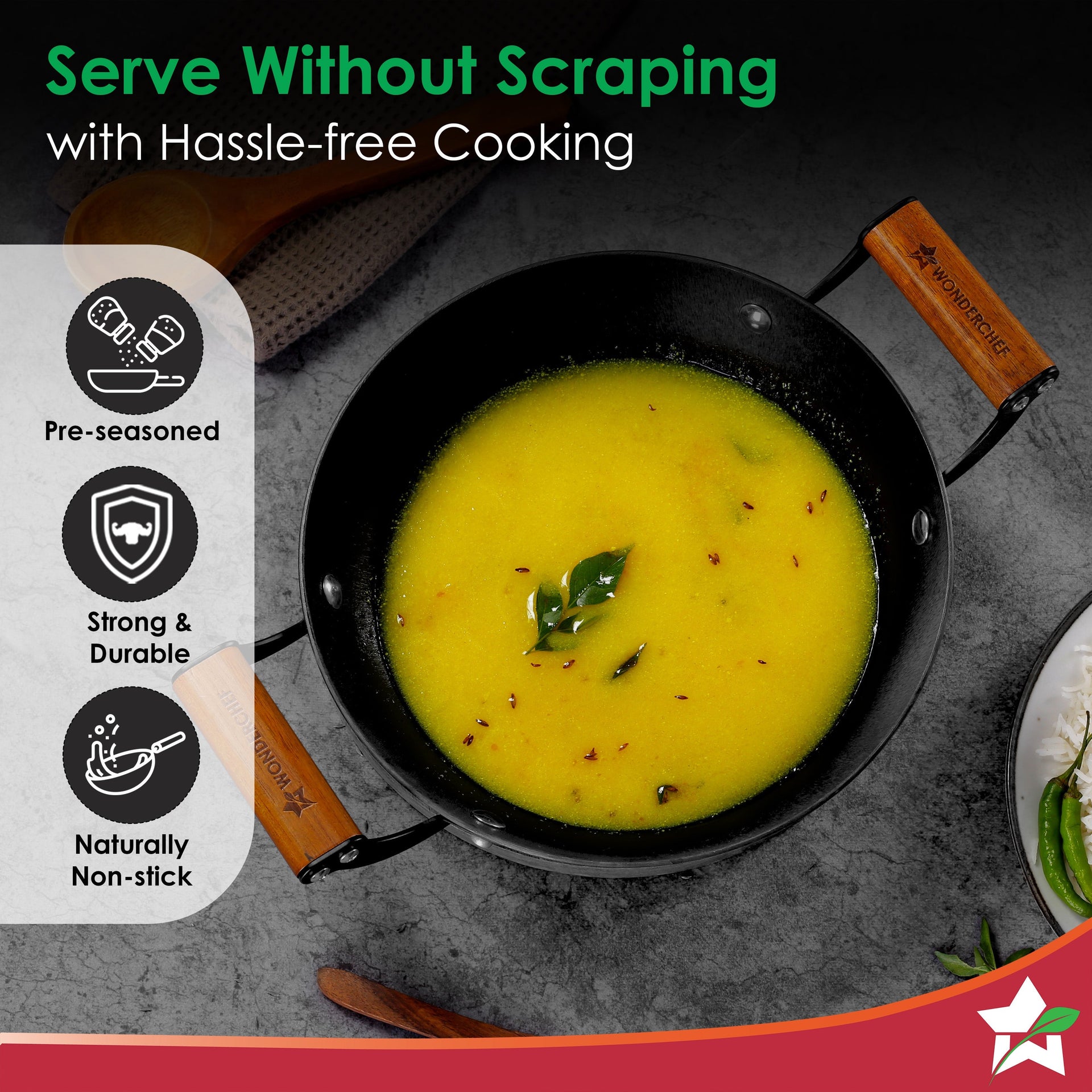 Pre-Seasoned Ferro Light 24cm Kadhai | 2.3L | Acacia Wooden Handles | Gravity Moulding Technology | No Chemical Coating |10 Year Warranty