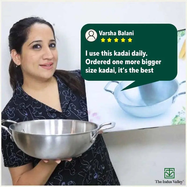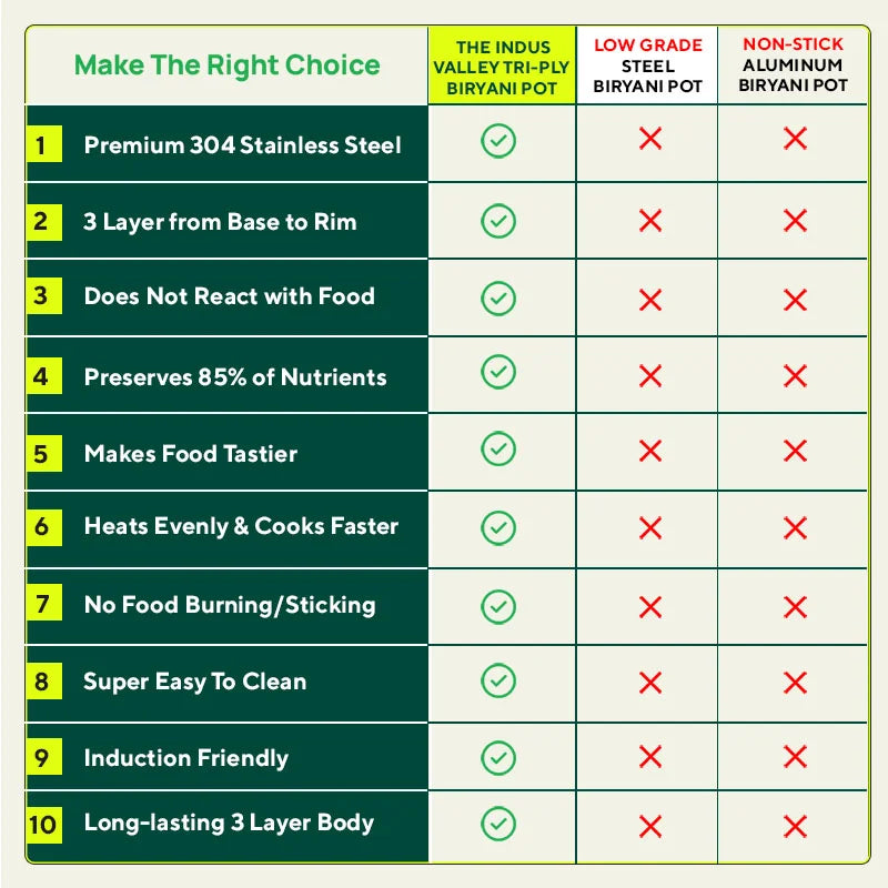 👌100% TOXIN-FREE: The Indus Valley's TurboCukTM Tri-ply Stainless Steel Cookware Combo: Kadhai/Kadai + Biryani Pot/ Casserole/ Stockpot/ Rice Cooking Pot is 100% toxin-free and food-safe. Truly healthier cookware combo than a nonstick set!
