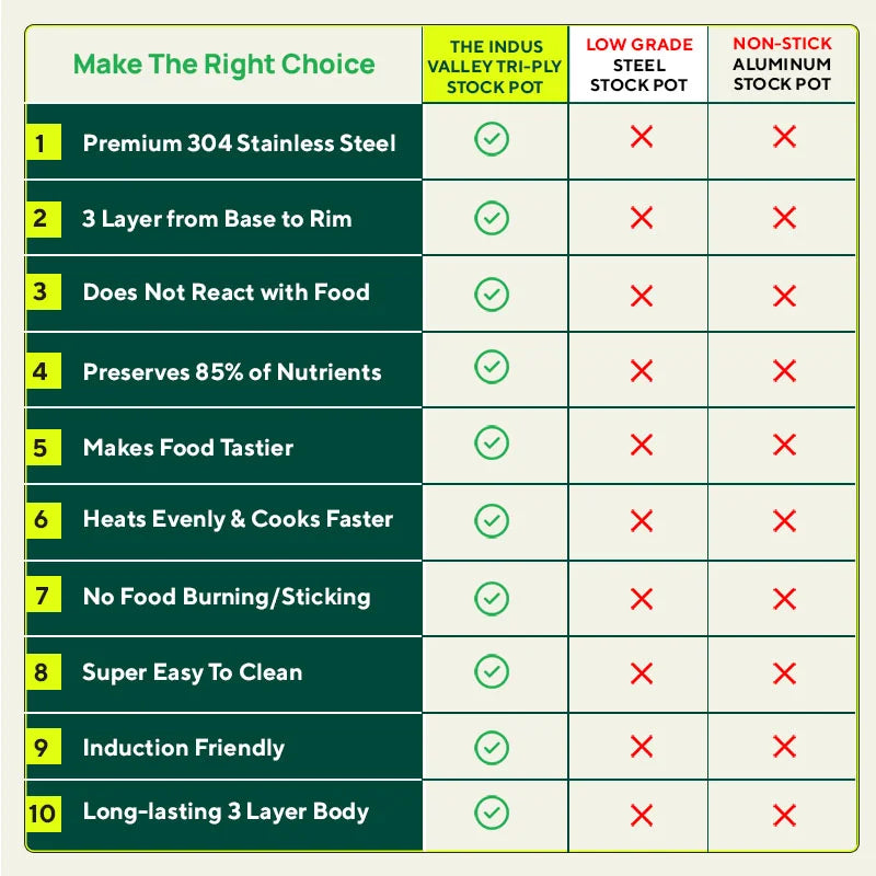 💪THREE-PLY CONSTRUCTION: Made of 3-layers of metals from base to rim, This Indus Valley stockpot with lid is 3 times better than normal stainless steel cookware. Call it a cookware that combines good looks with great utility!