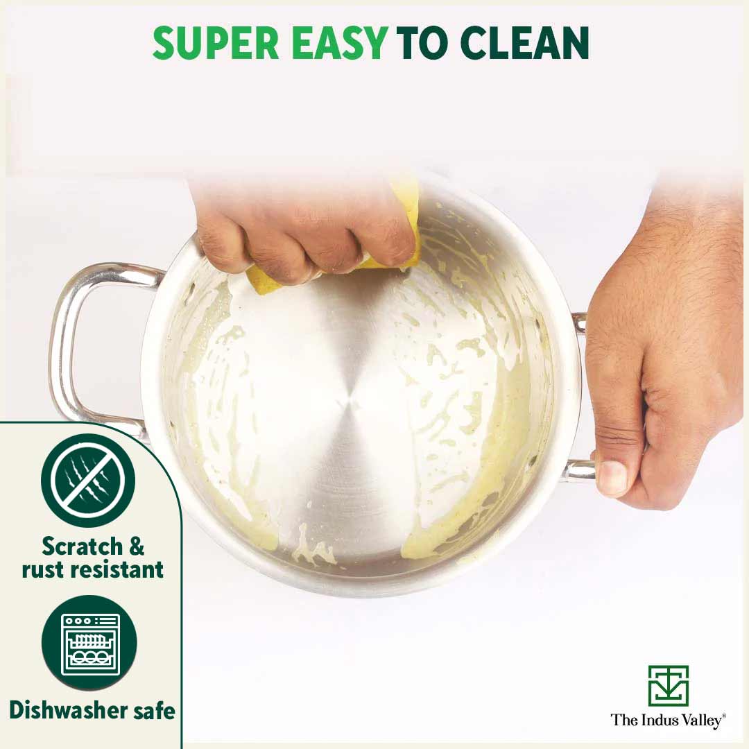 😍STYLISH AND CONVENIENT: The smooth, mirror-finish exterior gives the Triply steel cookware a premium look with aesthetic feel. The classy matt finish interior makes your food glide real smooth - giving you easy, hygienic cooking experience. The 2.7mm thick saucepot has a rimmed edge with a flat base and twin handle.