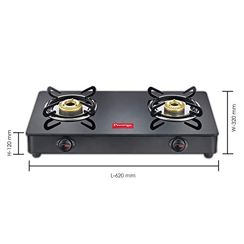 Prestige IRIS Toughened Glass-Top 2 Brass Burner LPG Gas Stove | Black | Spill Proof | Ergonomic Knobs | Tri-Pin Brass Burners