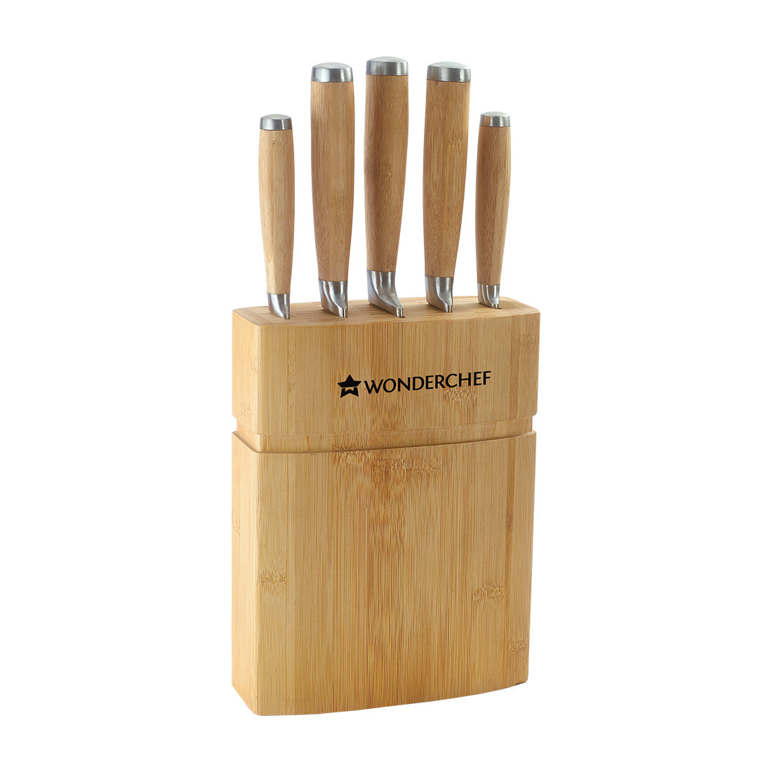 Wonderchef Razor Knife Block Set is a complete knife set with precision-honed blades for long-lasting sharpness and exceptional cutting performance. It is a combination of straight and serrated knives for all your prepping needs. The set comprises five distinct knives for cutting, chopping, mincing, slicing, dicing, peeling, trimming and other detailed work. The set includes below