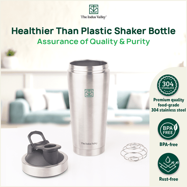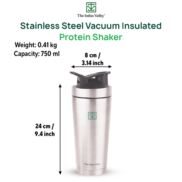 The Indus Valley Vacuum Insulated Stainless Steel Protein Shaker (750 ml) with Steel Agitator is 100% food-safe and toxin-free.