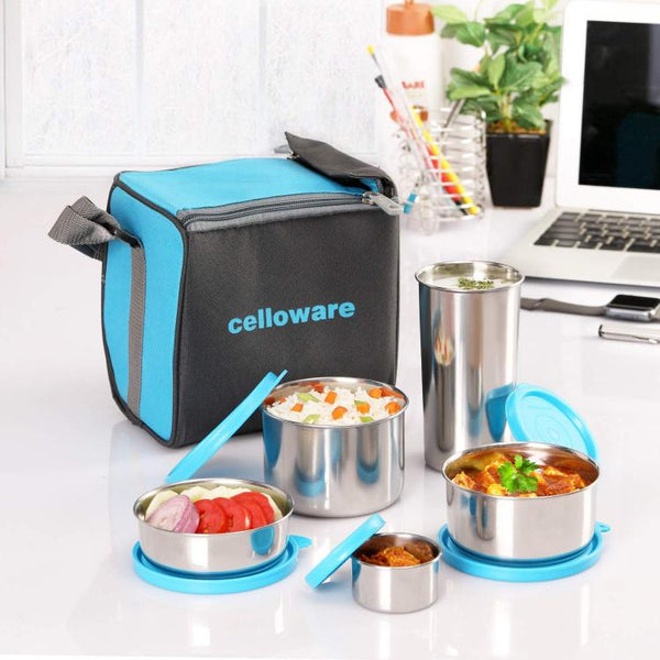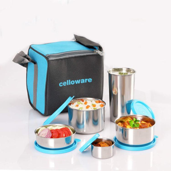 The Steelox Steel Lunch Box Combo, Set of 4 and Set of 5, in its captivating blue color, presents a holistic solution for your lunchtime needs. Included in this set is a practical bag designed with college or office use in mind, ensuring your lunch remains organized and fresh even on the busiest of days. Crafted from robust stainless steel, these tiffin boxes are built to endure daily use, establishing themselves as a dependable choice for your meal requirements.