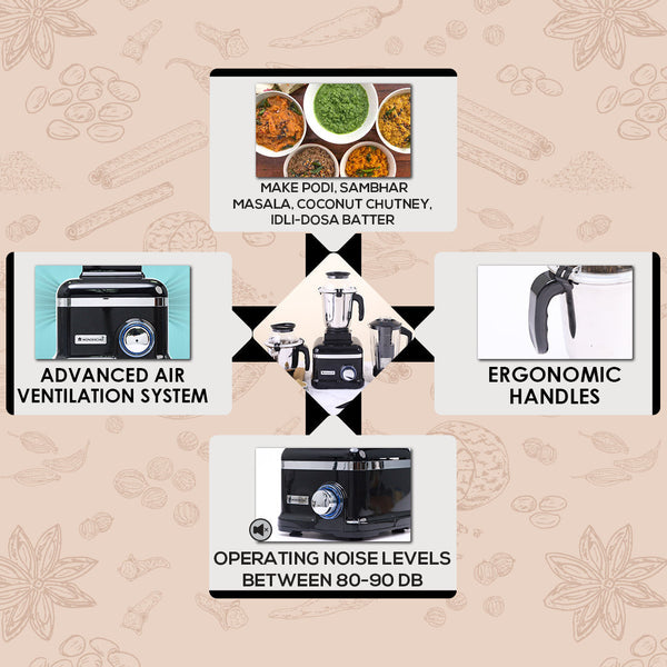 Make amazing podi, sambhar masala, coconut chutney, garam masala, idli-dosa batter, purée, pastes, milkshakes, smoothies and much more!