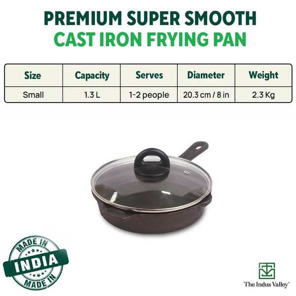 Super Smooth Cast Iron Fry Pan, Glass Lid, 100% Pure, Toxin-free, Pre-seasoned, Induction, Non-stick, 20.3/25.4cm, 1.3/1.7L, 2.3/2.4kg