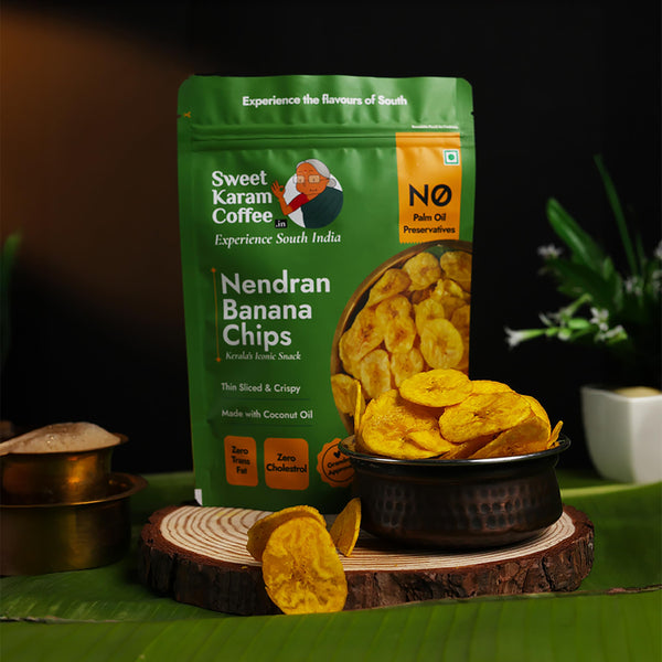 - Nendran Banana Chips – Sweet Karam Coffee Banana Chips is Made with handpicked nendran bananas and 100% coconut oil, we create the perfect snack with authentic Kerala flavour to satisfy your cravings anywhere, anytime.