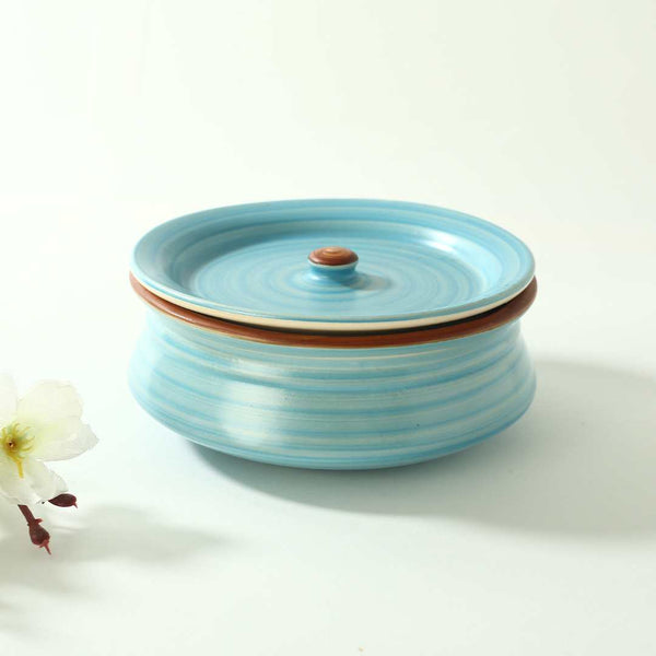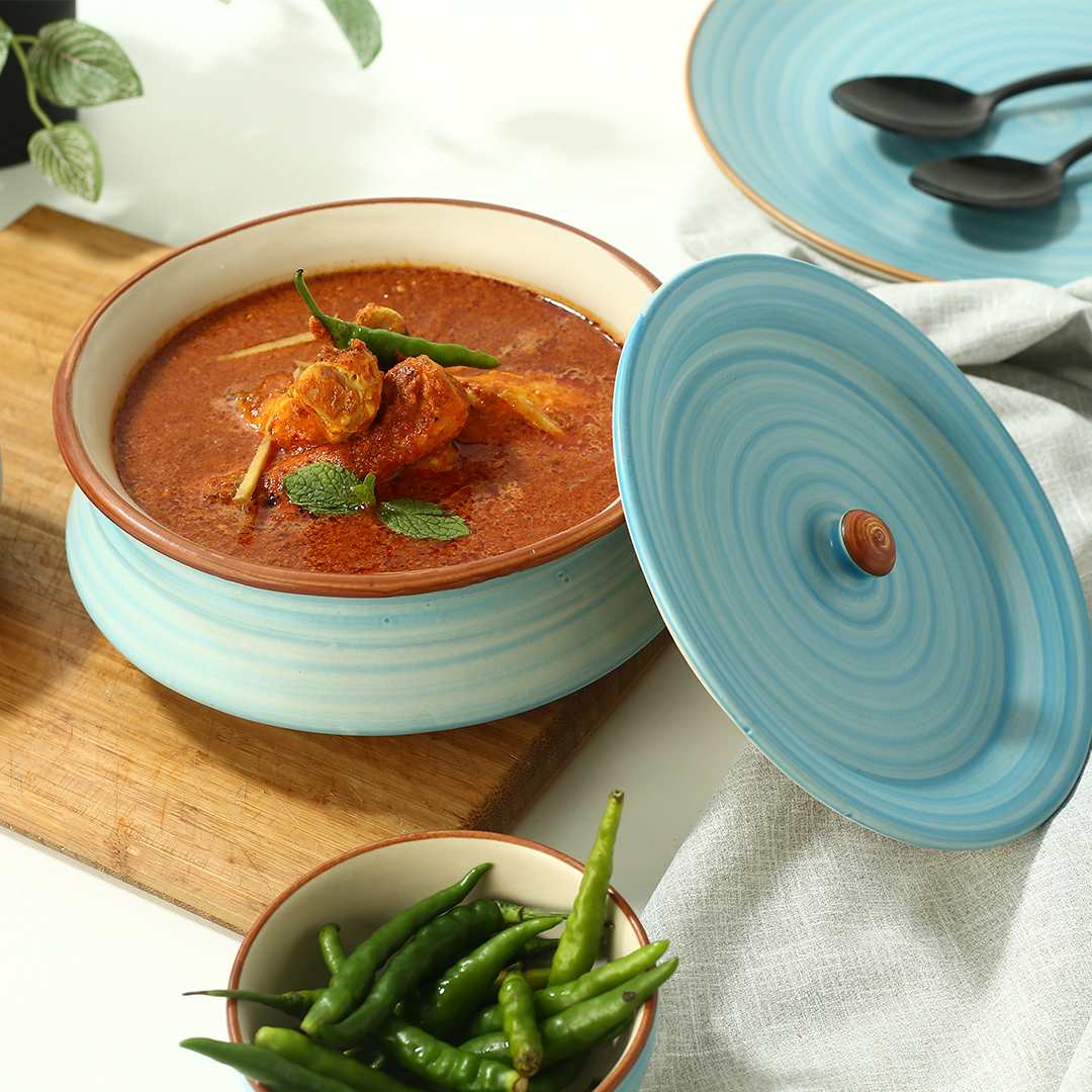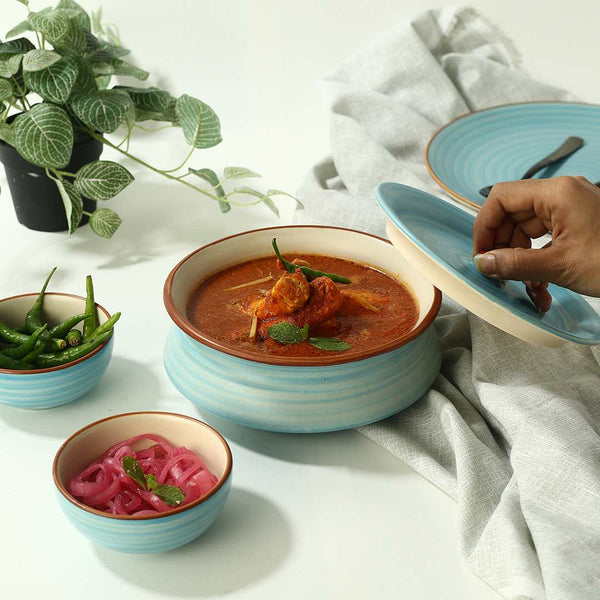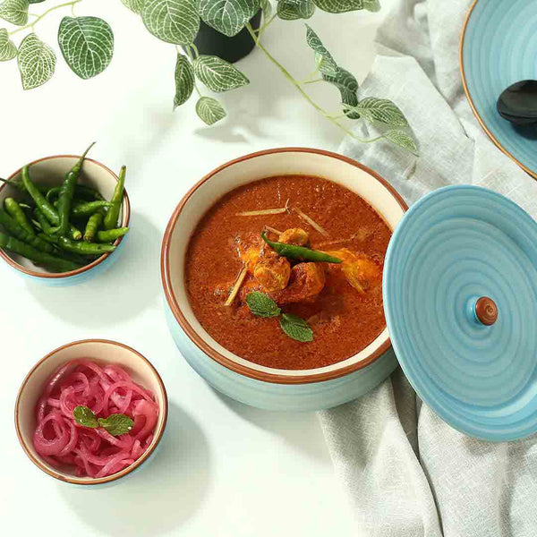 Serve your richly flavoured curry or an aromatic biryani in this Blue handi and get ready for compliments! The small sized handi is perfect for serving two people. Pair it with Teramo plates and bowls of the same collection and add a rustic vibe to your dinner table.