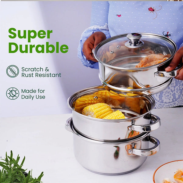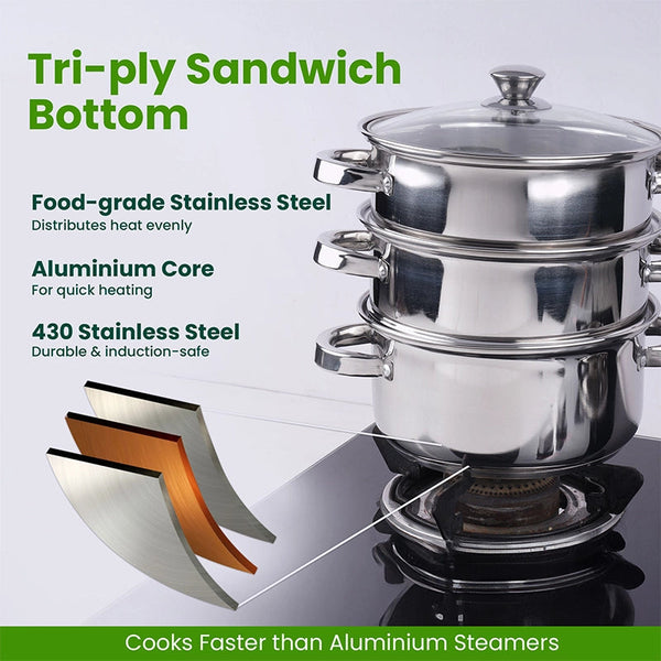 🧑🍳SUPERIOR PERFORMANCE: The 3-layered base of the stainless steel food steamer enables even heat distribution. It ensures excellent cooking results consistently.
