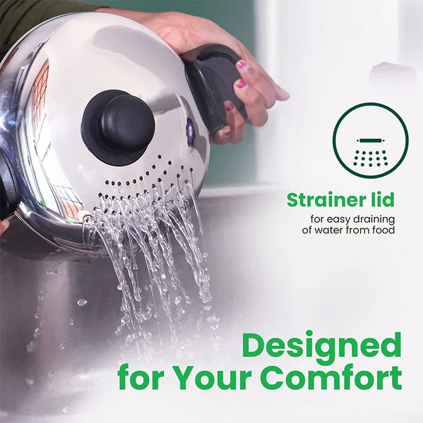 👌ELEGANT, SMART DESIGN: The pot is designed for your comfort. Its stainless steel strainer lid helps in easy draining of water from rice, noodles or pasta. The strainer pot has lockable bakelite handles which gives a secure grip, holds the lid in place while cooking and prevents spills.