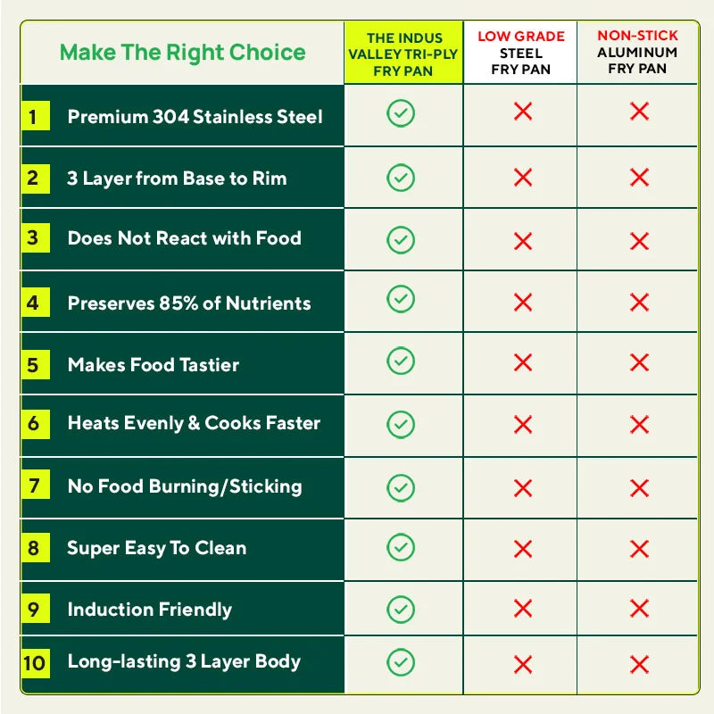 😎 THE BEST CHOICE: The Indus Valley’s triply frying pan is aesthetically designed for your comfort and safety. Without doubt you will call this as the best tri ply stainless steel frying pan in India. Don’t forget to check out The Indus Valley’s amazing stainless steel cookware set as well!