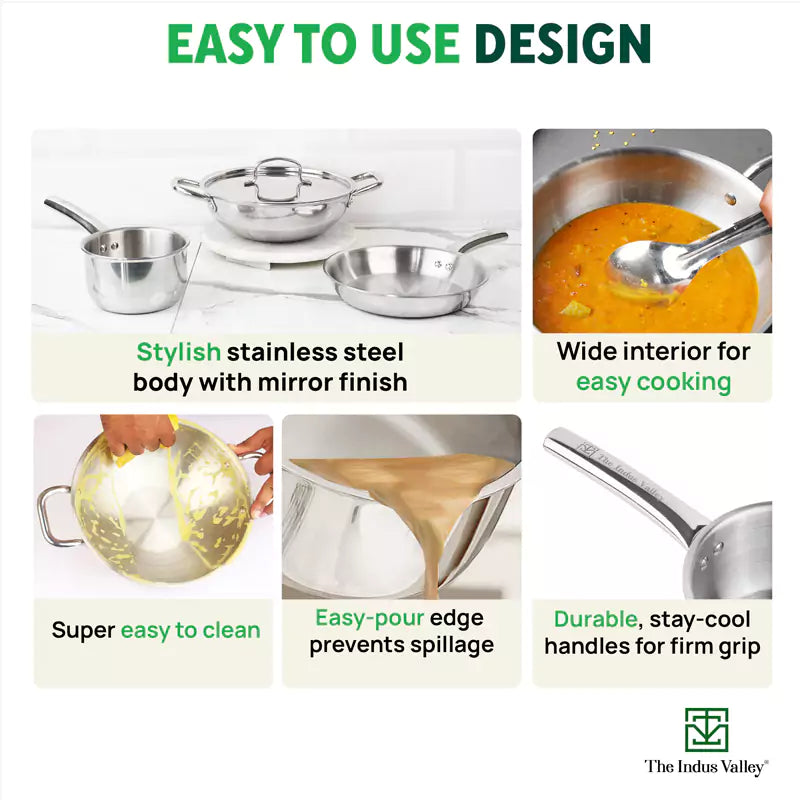 TurboCuk Tri-ply Stainless Steel Cookware Set: Kadai+ Frypan+ Tea/Milk pan, Premium Quality, 3 Layer Thick Body, 100% Toxin-free, Non-stick, Induction & Gas