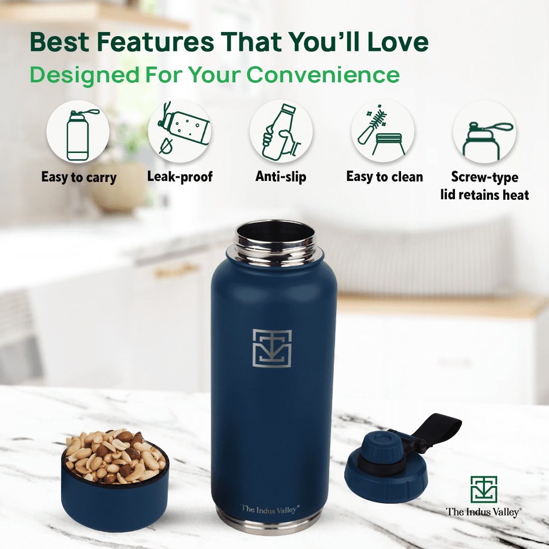 The Indus Valley Stainless Steel Vacuum Insulated Water Bottle Flask (900 ml) with Storage Container (150 ml) is made of 100% food-safe materials and is BPA-free.