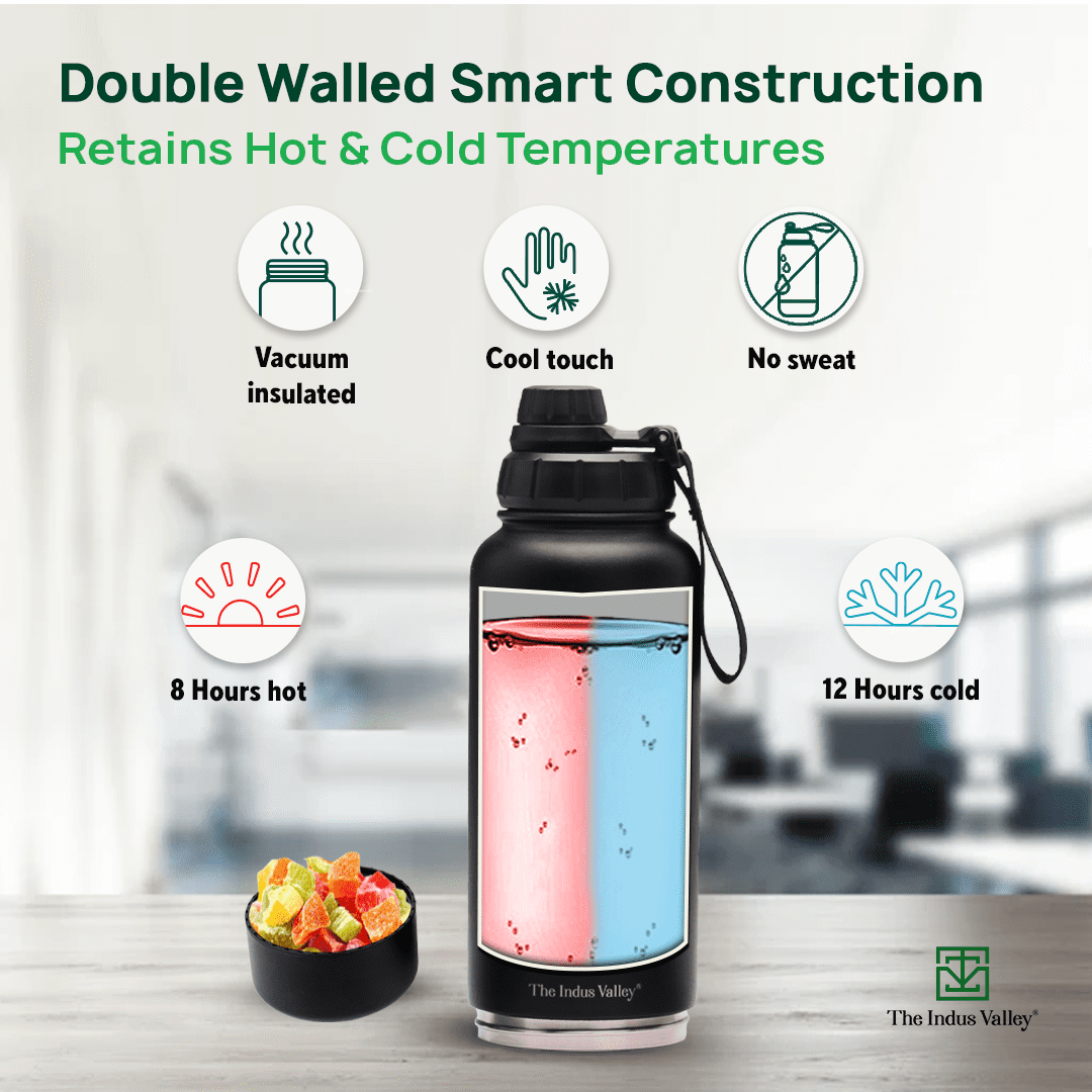 Due to its double-wall insulation, The Indus Valley flask bottle can keep beverages ice-cold for 12 hours and hot for up to 8 hours.