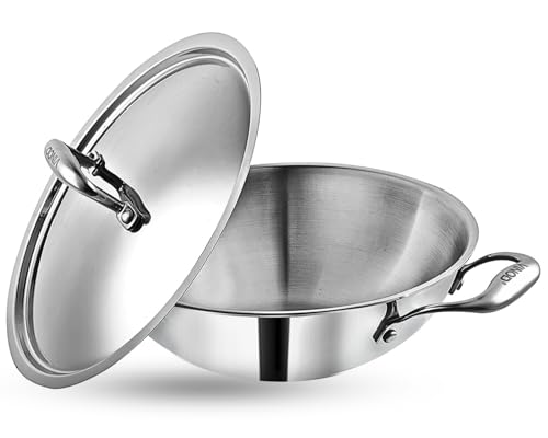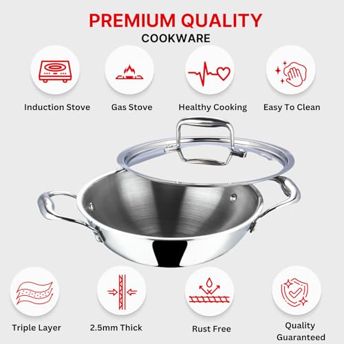- 👉TRIPLY STAINLESS STEEL CONSTRUCTION: The kadai features a three-layer construction, with an inner layer made of food-grade 18/8 stainless steel for healthy cooking, a middle layer of encapsulated aluminium for even heat distribution, and an outer layer of 430 magnetic stainless steel for induction compatibility.
