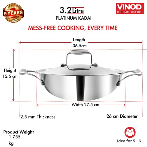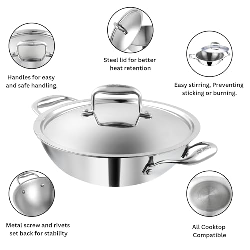 - 👉PACKAGE CONTENT: 1 Triply stainless steel Kadai 3.2 litres Capacity (26 cm Diameter) and 1 stainless steel Lid