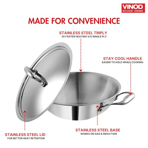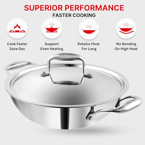 - 👉DURABLE AND AESTHETICALLY PLEASING DESIGN: The tri-ply stainless steel body is durable, rust-free, and scratch-resistant. The kadai boasts an aesthetically pleasing design with a mirror-polished finish outside and an emery finish inside. It is an ideal gifting solution and a must-have cookware in every Indian kitchen.