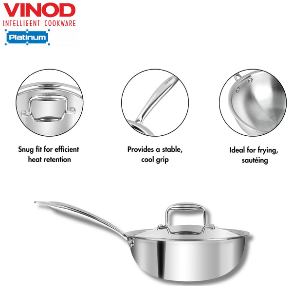 Details: Vinod Platinum triply stainless steel series is made up with SAS technology, which is a triple layer construction of stainless steel, aluminium and stainless . The inner layer is made up of food grade 18/8 stainless steel, which is hygienic stainless steel and rust free.The middle layer is consists of aluminium throughout, this ensures in even heat distribution and uniform cooking of food. The third layer is made of 430 stainless steel for induction compatibility.