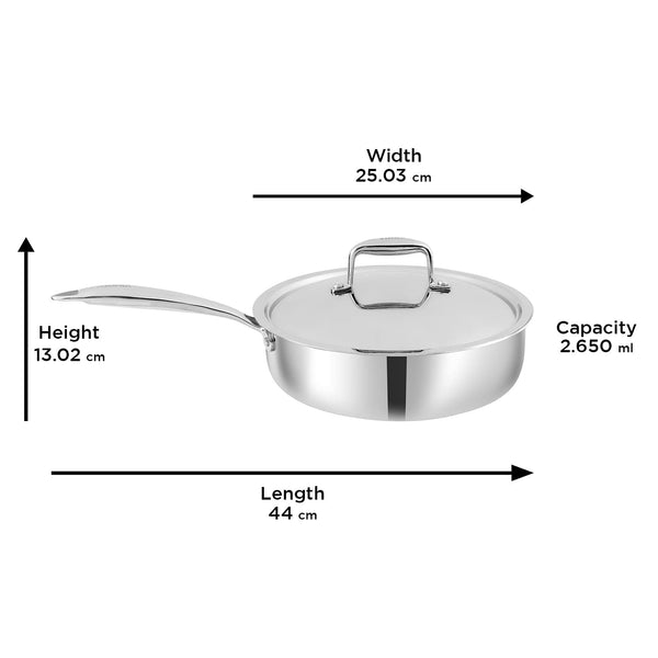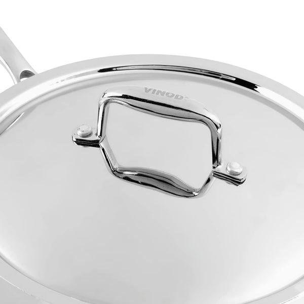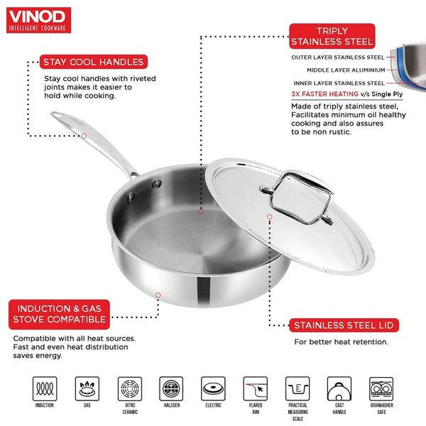 Vinodβs Saute pan is made of premium stainless steel material (18/8) Grade to make your sautΓ©ing moment hygienic and stress free. It is made with SAS Technology that is 3 Layer technology, wherein 3 layers are as below: Stainless Steel β Aluminium- Stainless Steel. The Layers: Evenly constructed to ensure that heat is distributed evenly throughout during the cooking process and not to a selective spots of the pan. Handle: To enhance your cooking experience, The Handle of this pan is riveted to make it extra strong & is ergonomically designed to ensure a firm grip while dealing with the pan the middle layer is consists of aluminium throughout, this ensures in even heat distribution and uniform cooking of food. The third layer is made of 430 stainless steel for induction compatibility. This triply stainless steel frypan comes with riveted stainless steel handle that is ergonomically designed, provides maximum durability and extreme comfort. It is compatible across all heating platforms like gas, induction, ceramic, infrared and hotplate. Make wholesome nutritious healthy dishes including stir fried vegetables, omelette, gravies, pancakes, fish fries and much more.