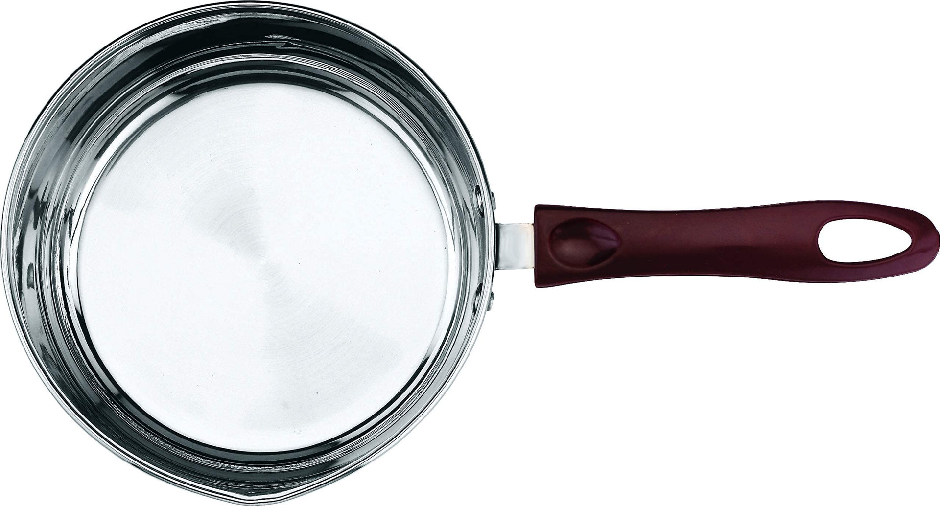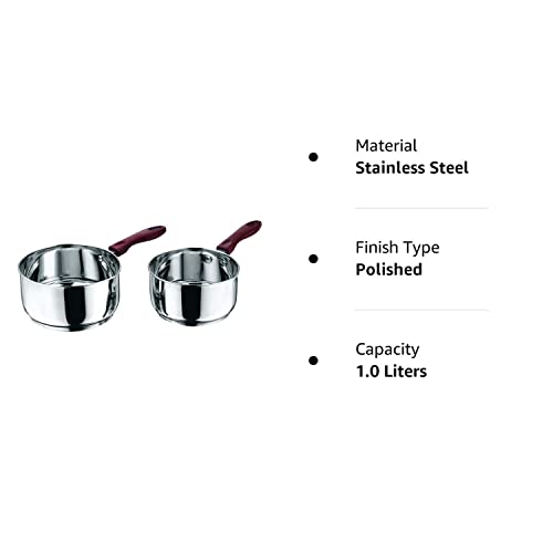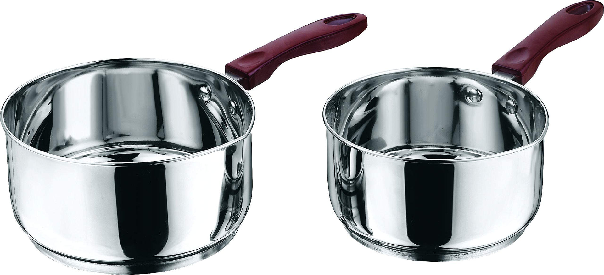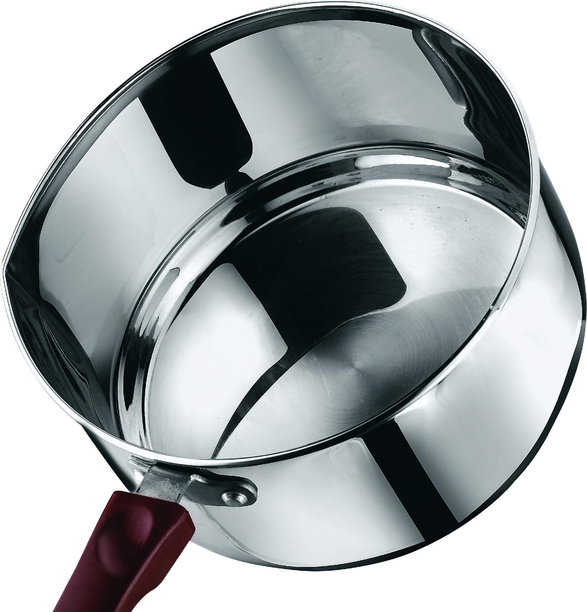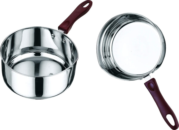 Details: This stainless steel milkpan combo has SAS bottom with an aluminium core which ensures even heat distribution so that your food cooks evenly and does not burn. It is made up of hygienic stainless steel which is easy to clean. The handles are heat resistant and riveted for better grip and durability. Made from food grade high quality, thick stainless steel for longer use. To ensure uniform and faster cooking an inner layer of food safe AISI 304 grade stainless steel sandwhiches a layer of high quality virgin aluminium. The base is a layer of AISI 430 grade magnetic stainless steel makes the cookware induction compatible.Β The stainless steel Milkpan can be used for boiling milk or water and can also be used for making tea, coffee, soup, sauces,Β making instant noodles or for re-heating food.